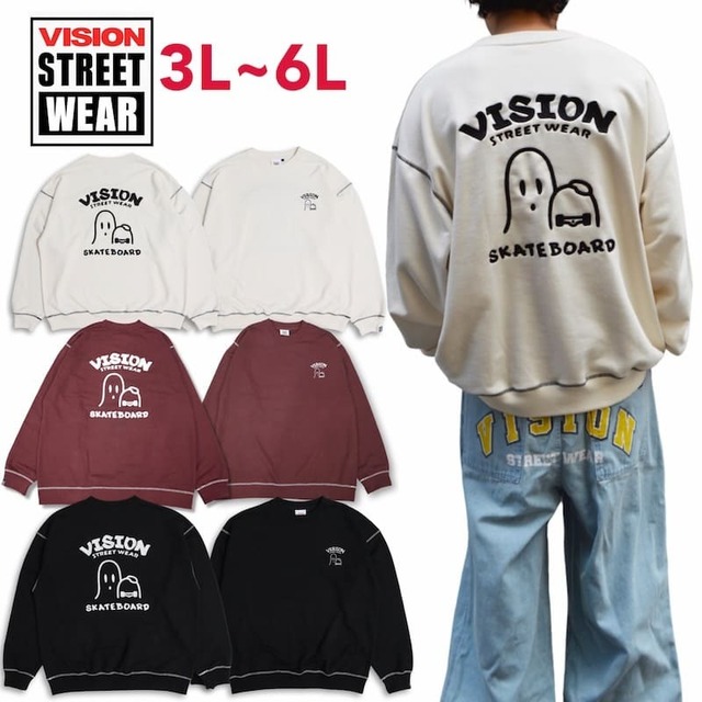 【送料無料】大きいサイズ メンズ ヴィジョン VISION 長袖 トレーナー スウェット 裏毛 ゴースト スケーター スケボー おばけ キャラクター 刺繍 ユニセックス レディース キングサイズ ホワイト ブラック ワイン 3L 4L 5L 6L