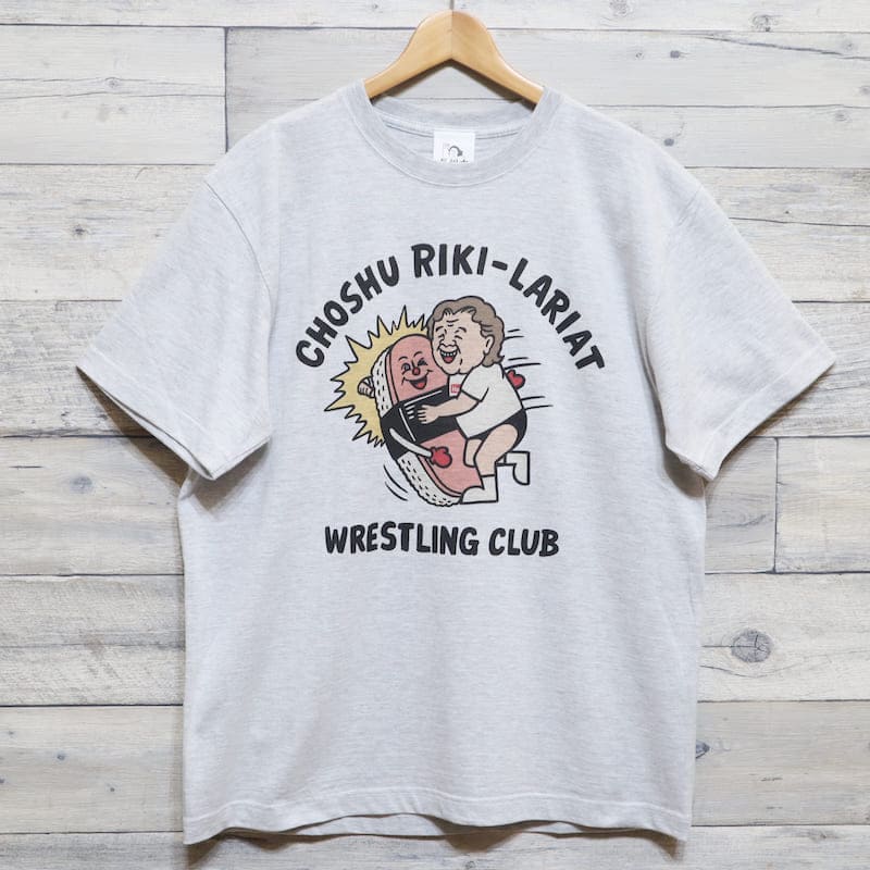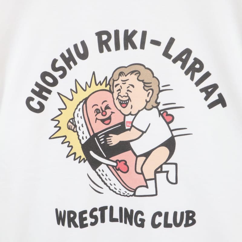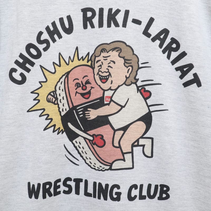 大好物のスパムおにぎりにラリアットをする長州力さんを手描きのイラストタッチで描いた可愛いデザイン。