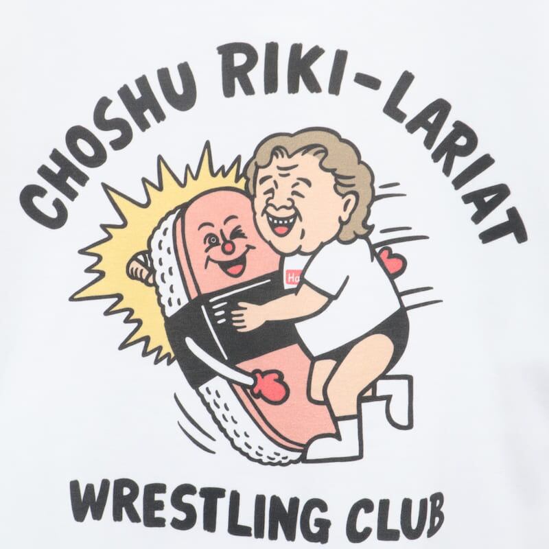 大好物のスパムおにぎりにラリアットをする長州力さんを手描きのイラストタッチで描いた可愛いデザイン。