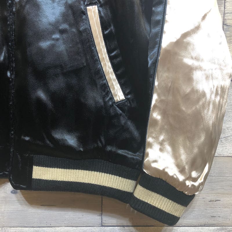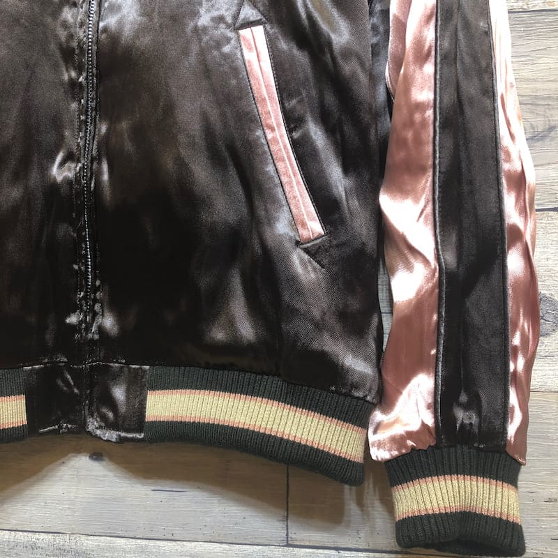 高品質なレーヨンサテン生地を表面に使用し、素材のチョイスや刺繍糸に至るまでこだわりの逸品は、レーヨン素材特有の経年変化を楽しみながら、いつまでも永く着ていただきたい一枚に仕上がってます。