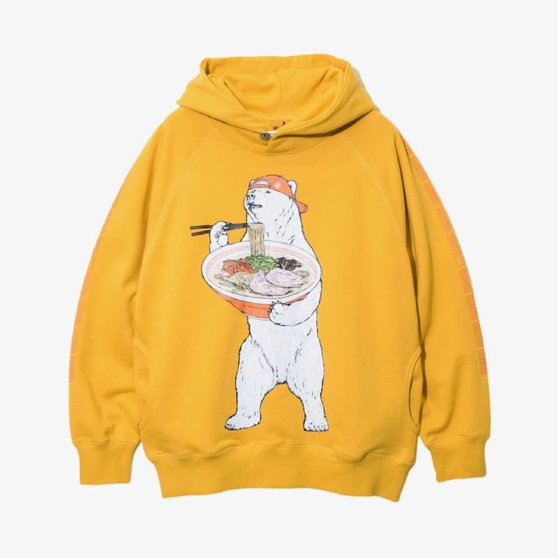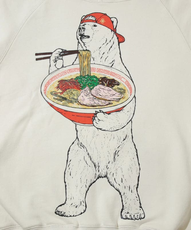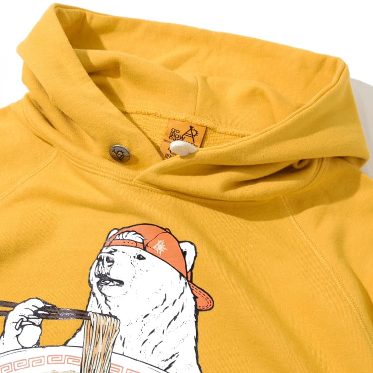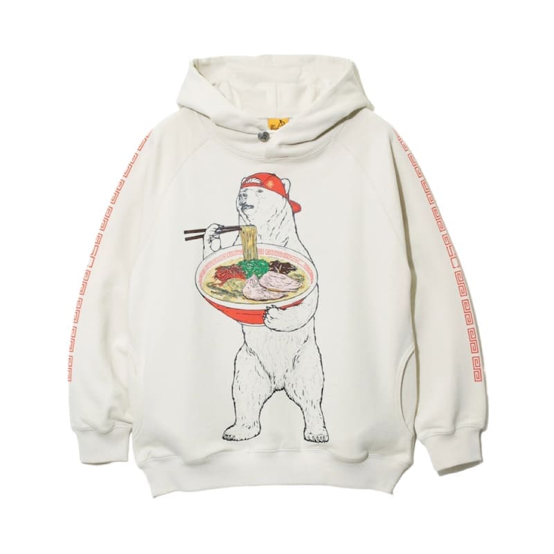 人気アウトドアブランド 【go slow caravan】(ゴースローキャラバン)の新作、豚骨ラーメンクマプルパーカー。