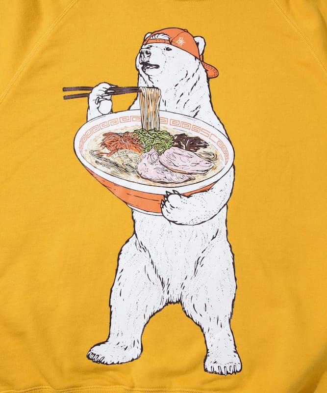 美味しそうなラーメンを抱えるクマがインパクト抜群です。