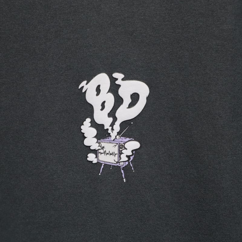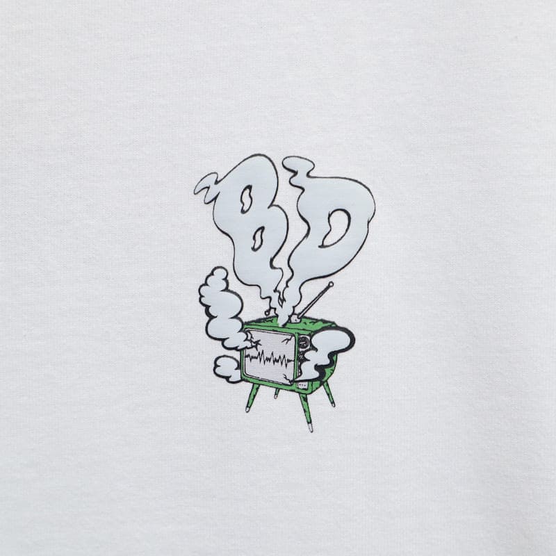 壊れたテレビから出ているスモークでブランドロゴ「BD」を表現。