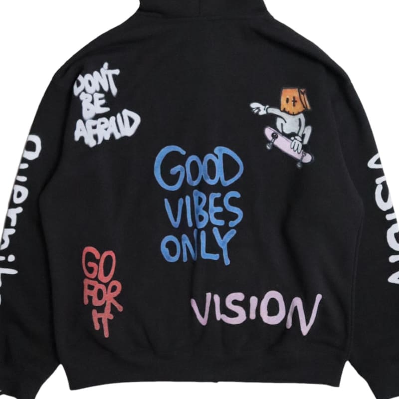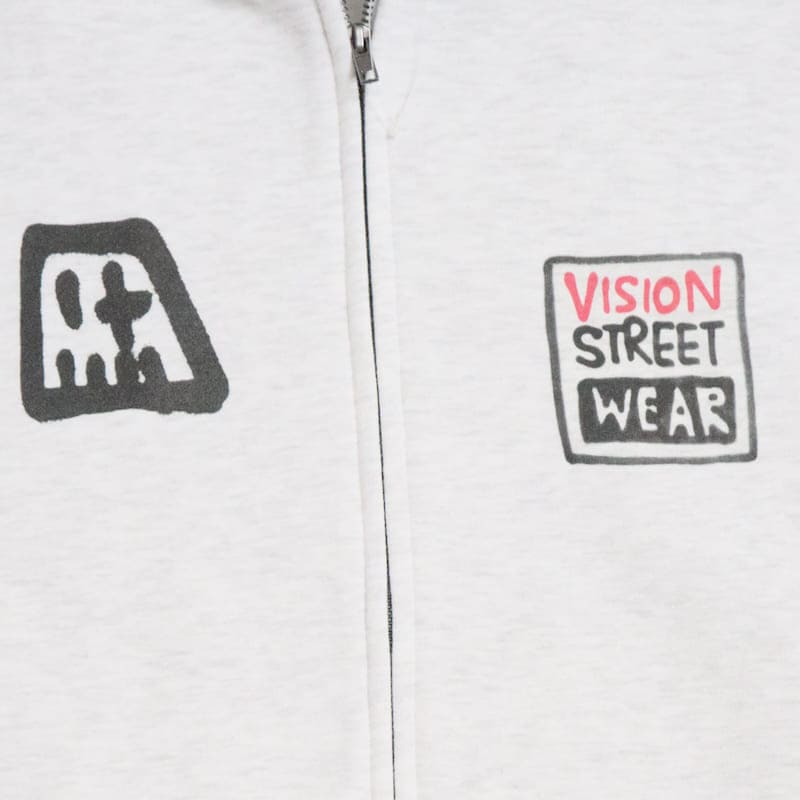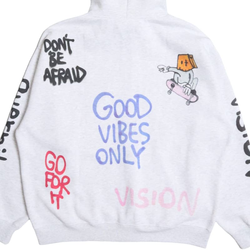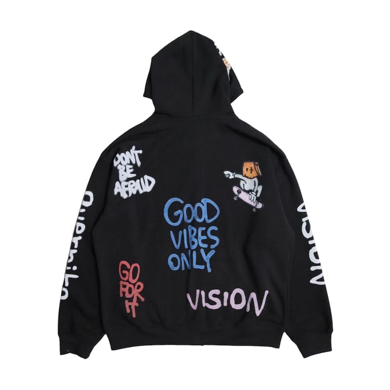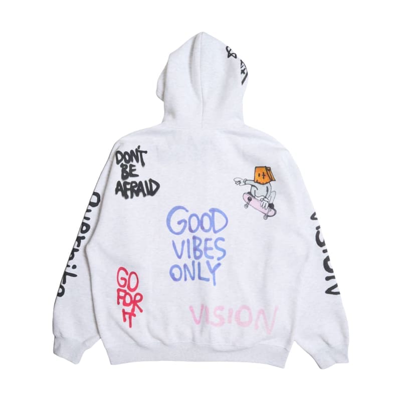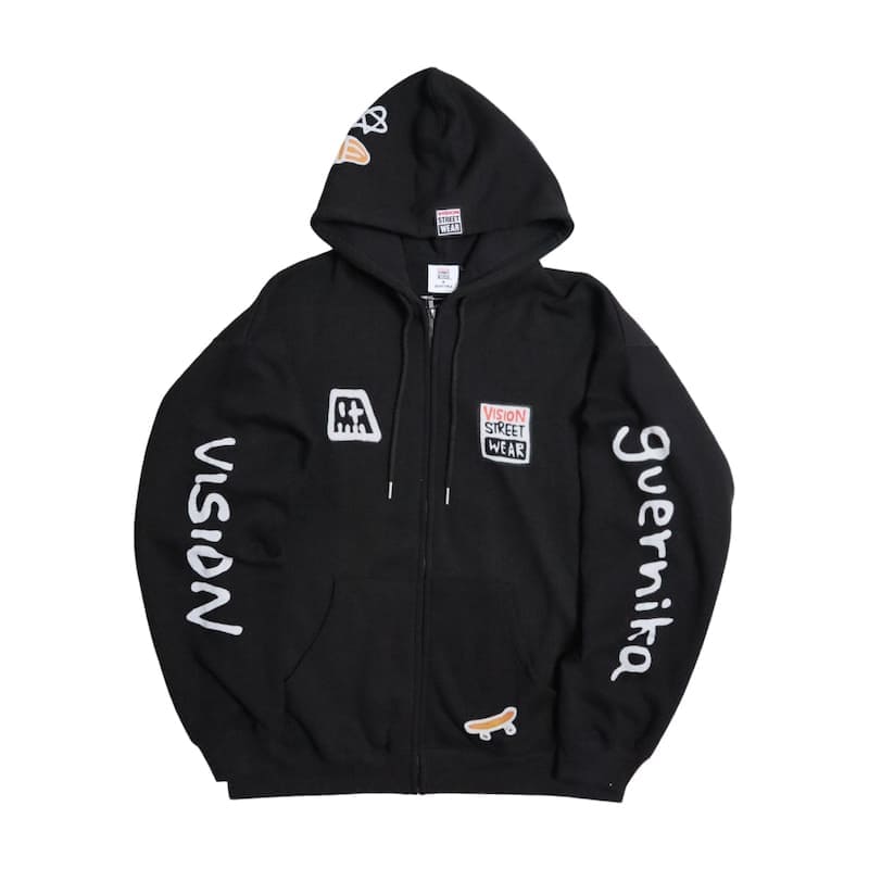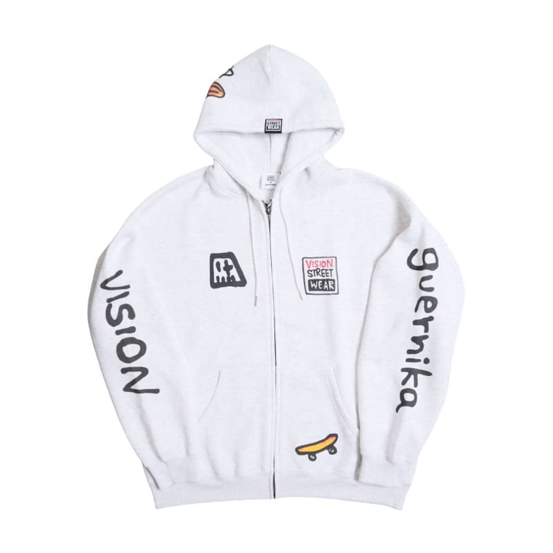 【送料無料】メンズ vision street wear ヴィジョン guernika ゲルニカ コラボ パーカー フーディー スウェット ジップアップ フルジップ 長袖 アノニマウス 総柄 イラスト プリント オーバーサイズ 裏起毛 ユニセックス レディース ライトグレー 黒 ブラック | DEF STORE