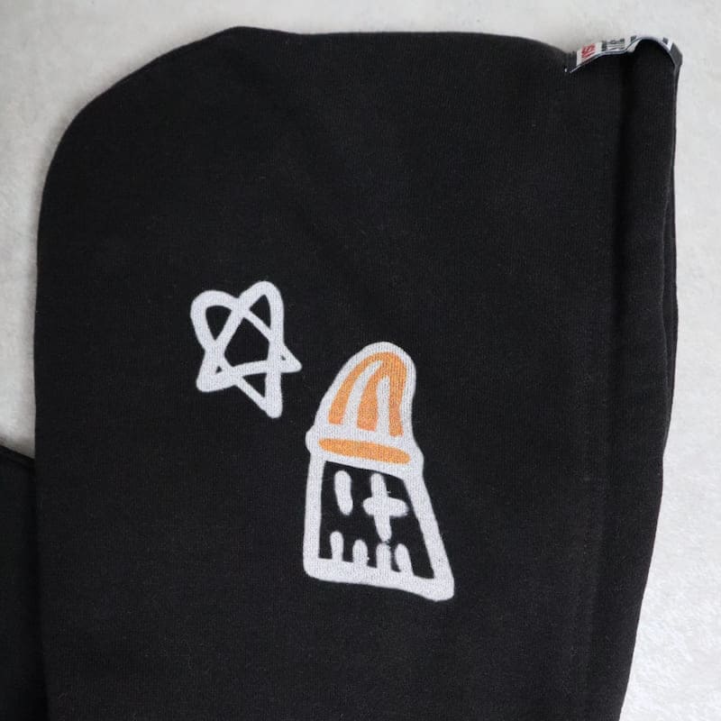 本コラボのために描きおろしたロゴやグラフィック・イラストを全面にプリントした総柄のスウェットパーカー。