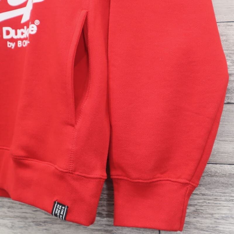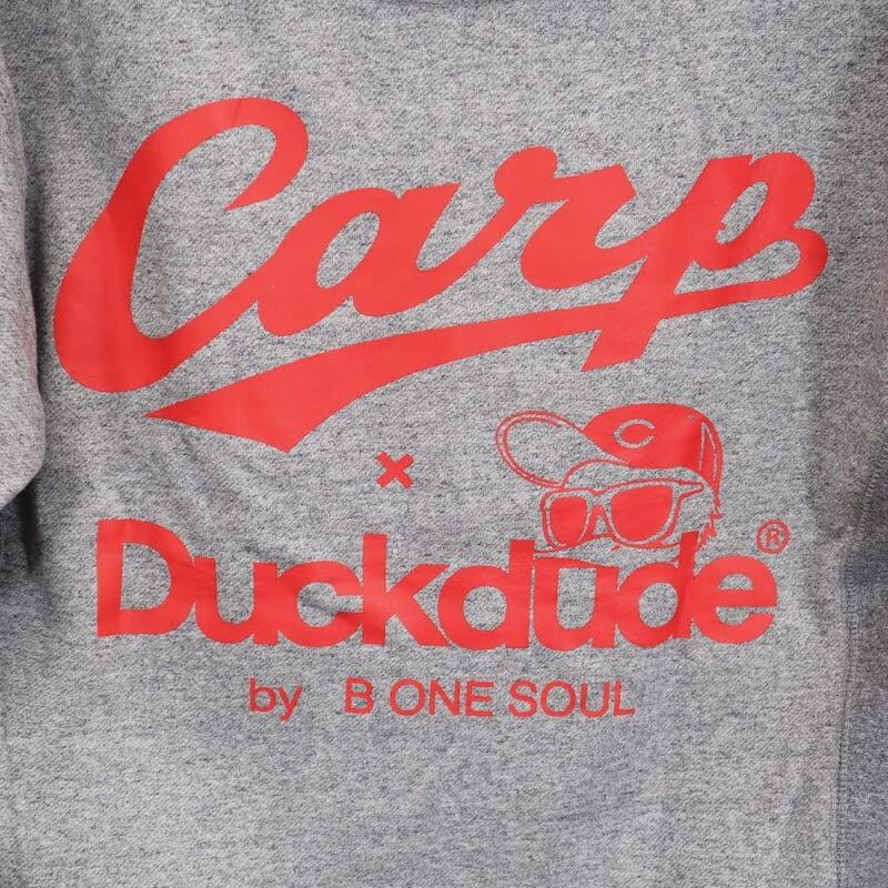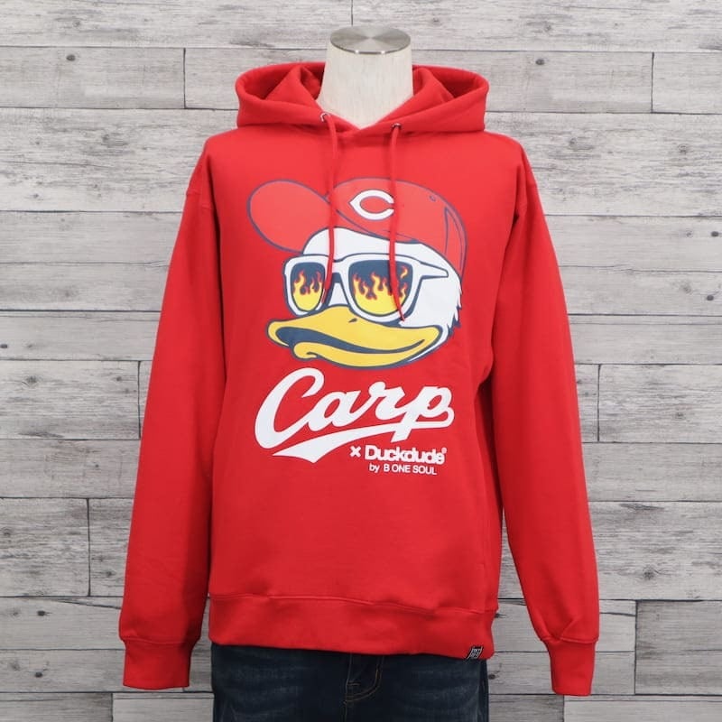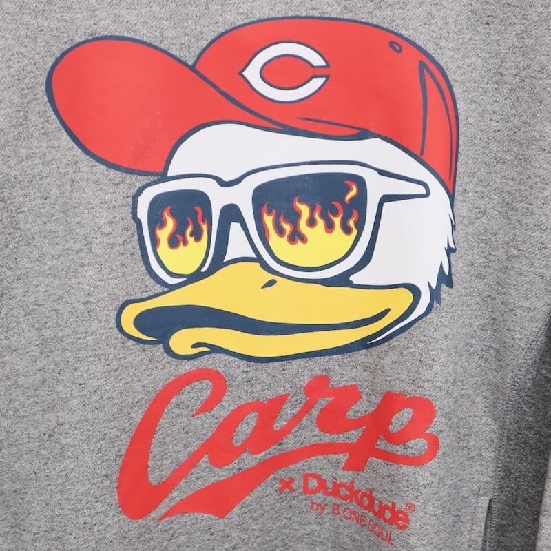 カープの帽子を被ったダックをフロントに大きくプリントした裏起毛パーカーです。