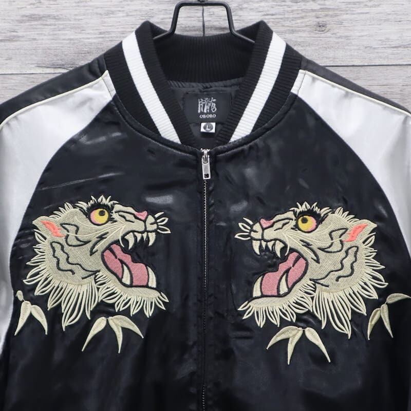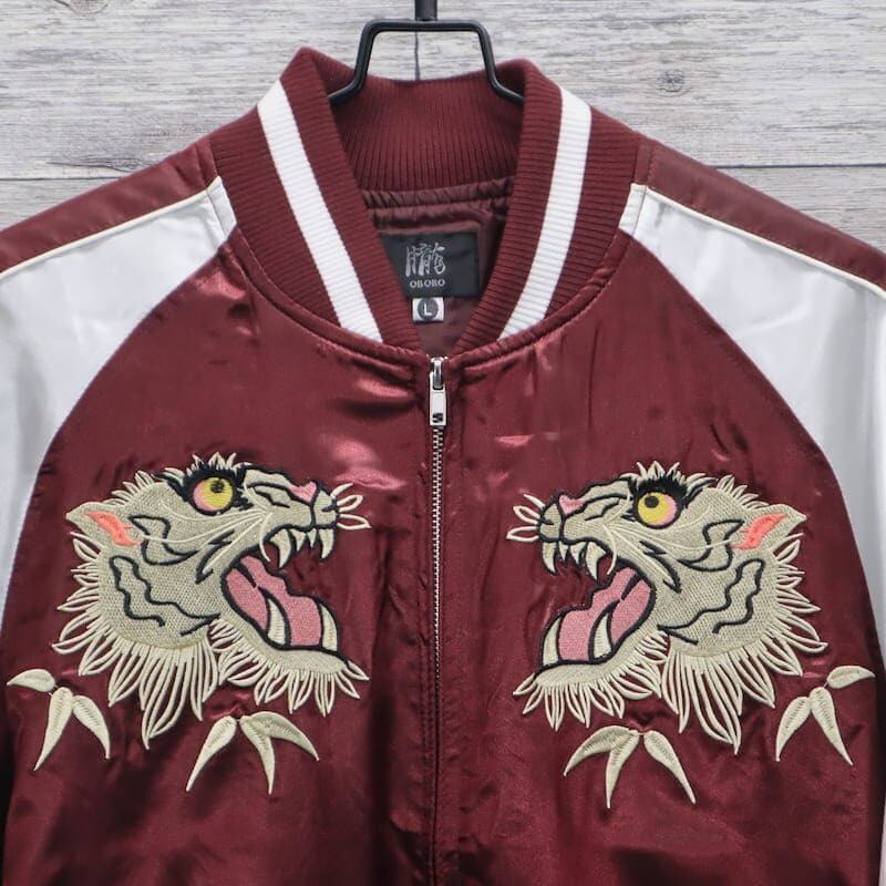 こだわりのデザインと豪華な刺繍が人気のブランド、【朧】の虎柄のサテンスカジャン。