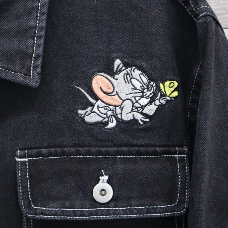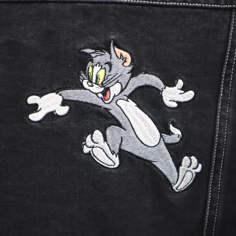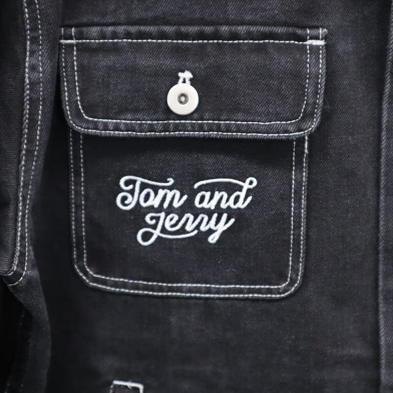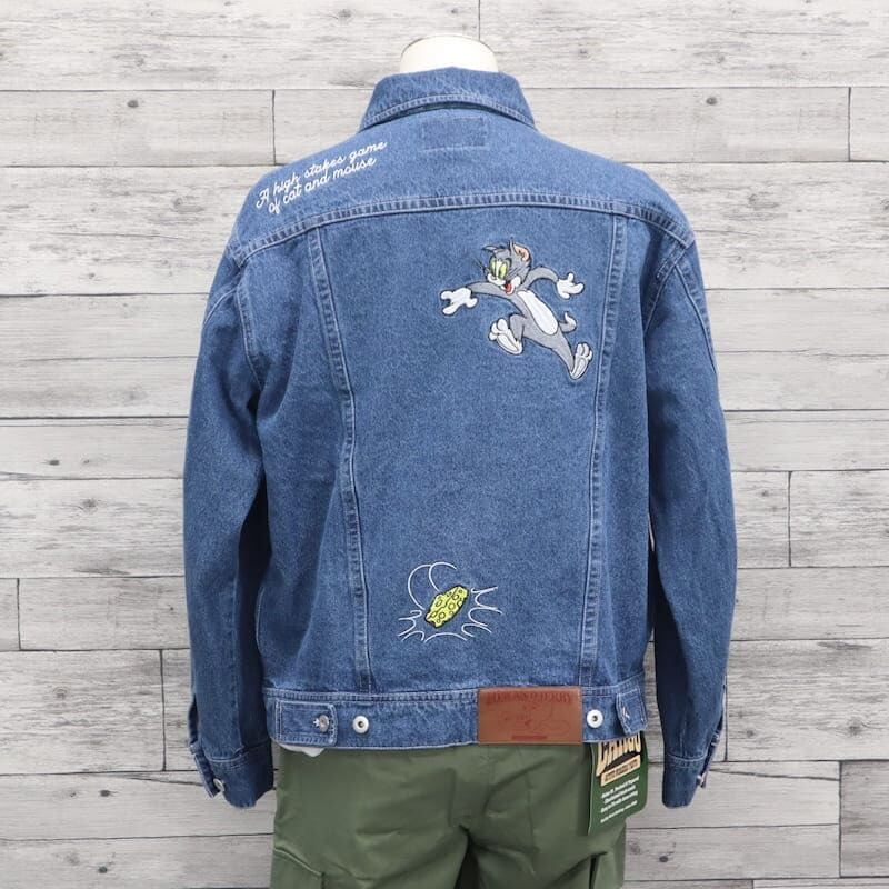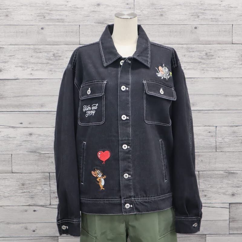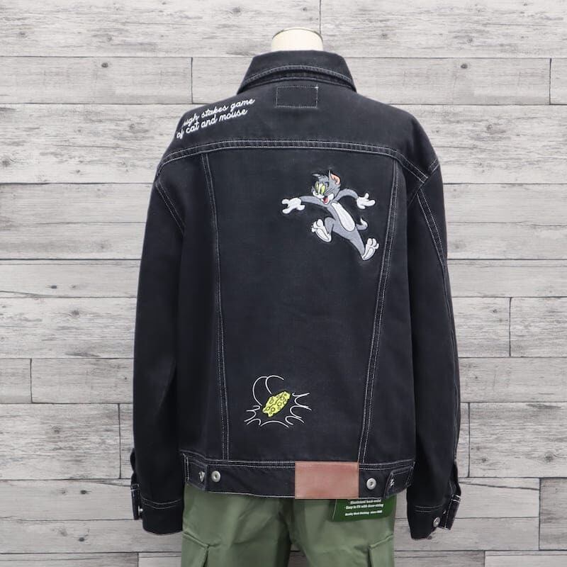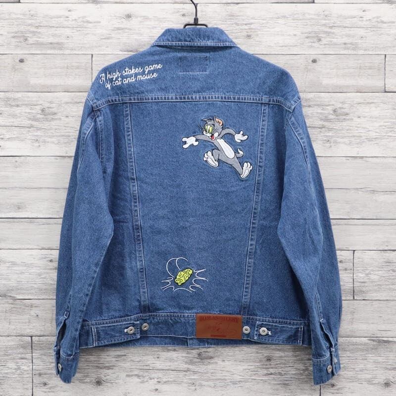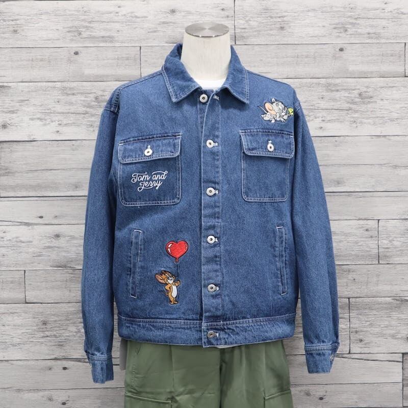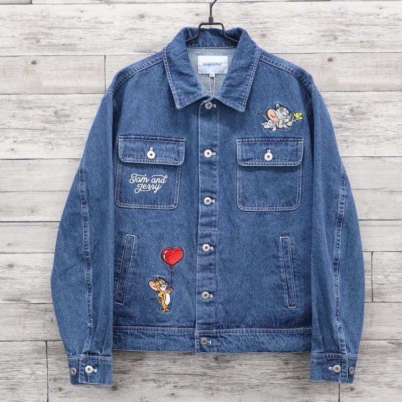 【送料無料】メンズ トムとジェリー シークエンズ コラボ デニムジャケット Gジャン 羽織り ライトアウター ビッグシルエット オーバーサイズ トムジェリ TOM&JERRY 刺繍 ユニセックス レディース 青 ブルー 紺 ネイビー 黒 ブラック | DEF STORE