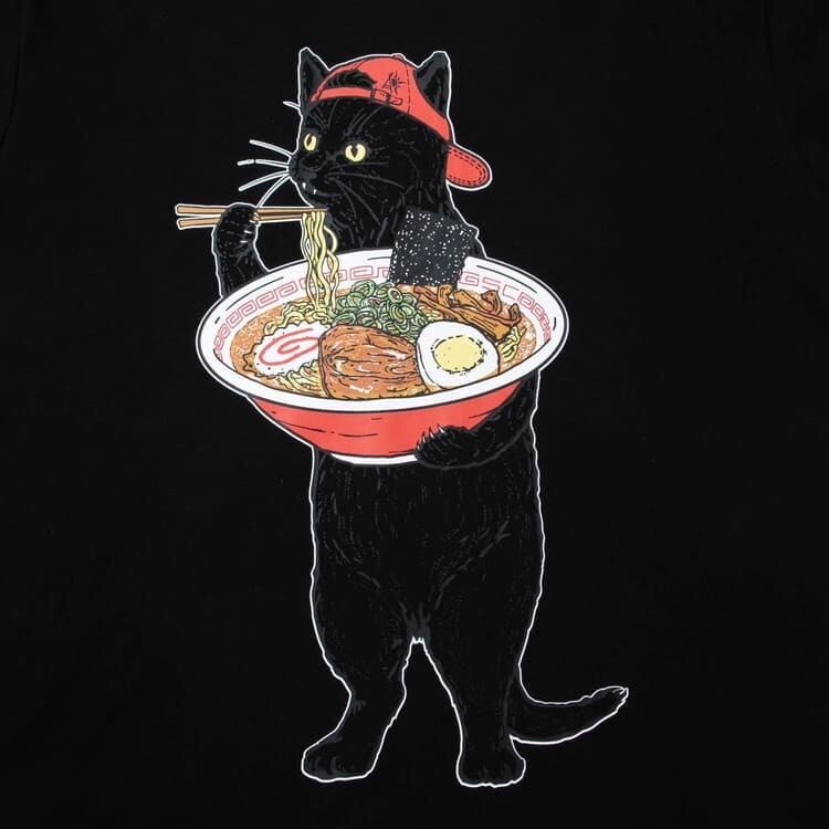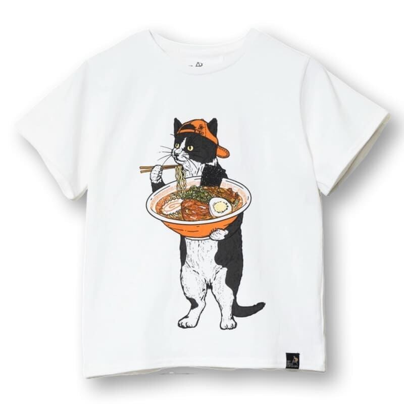 安心感のある素朴な味わい、元祖中華そばをもつ猫のプリントT。