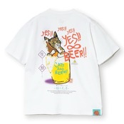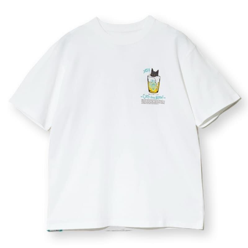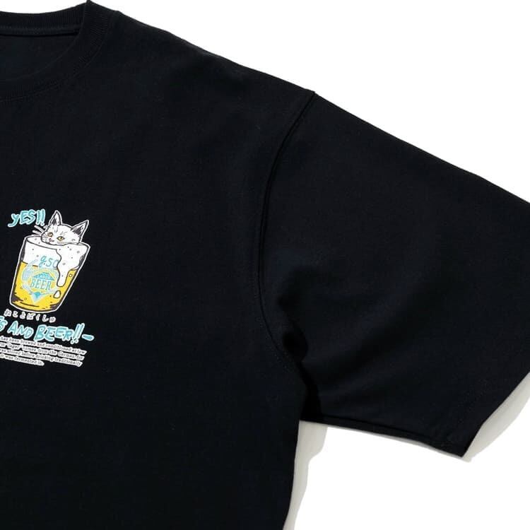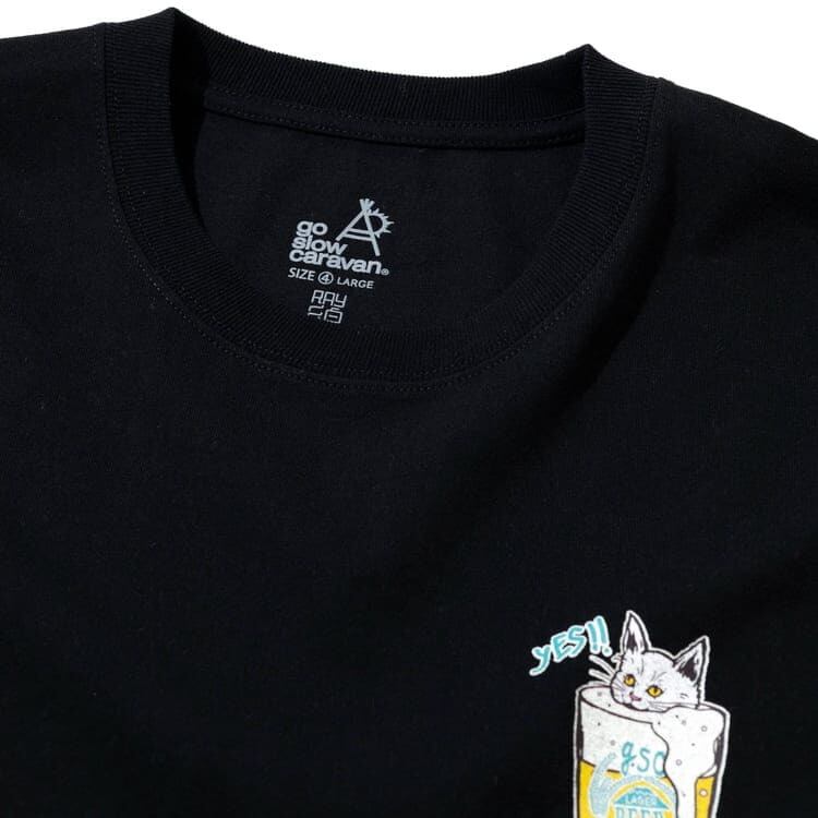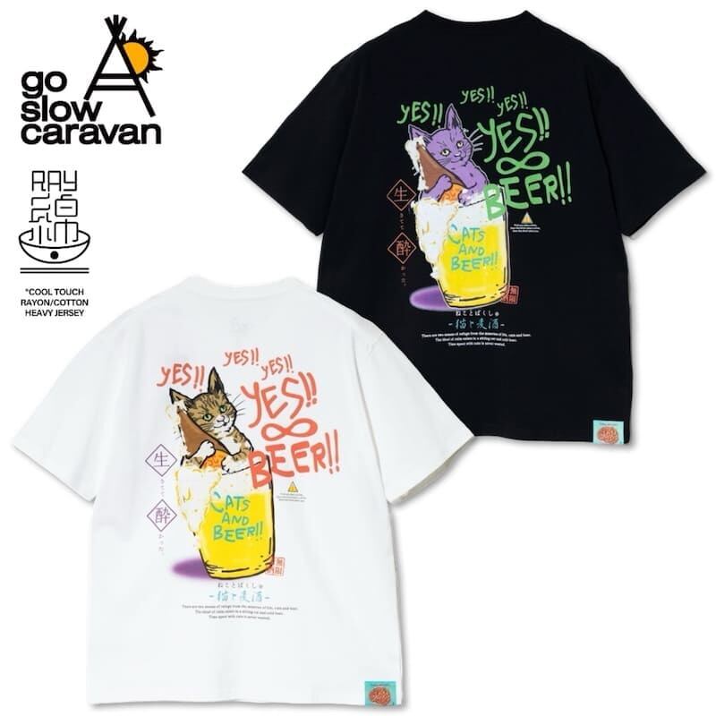人気アウトドアブランド go slow caravan(ゴースローキャラバン)の大人気シリーズ新作、猫と麦酒半袖Tシャツ。