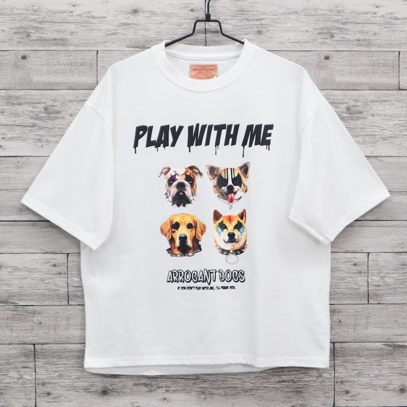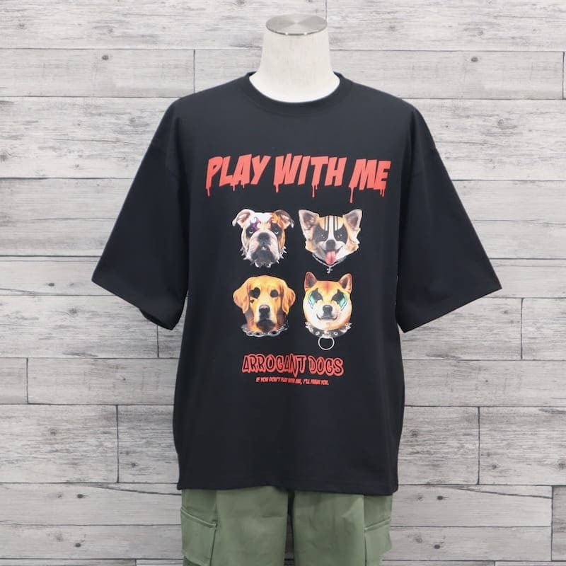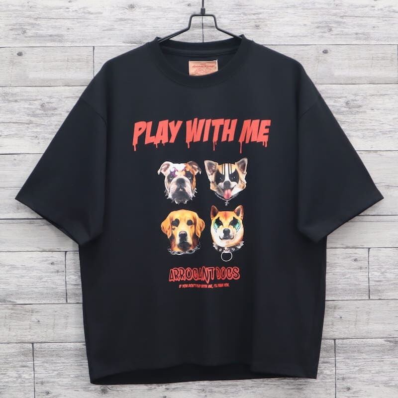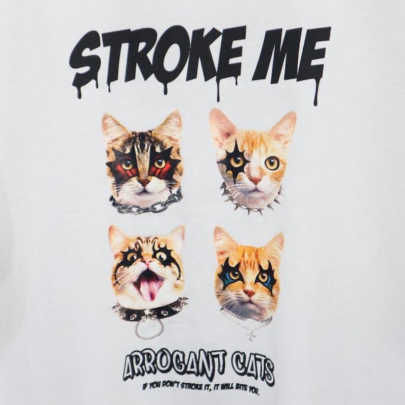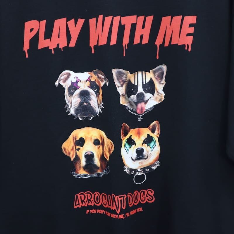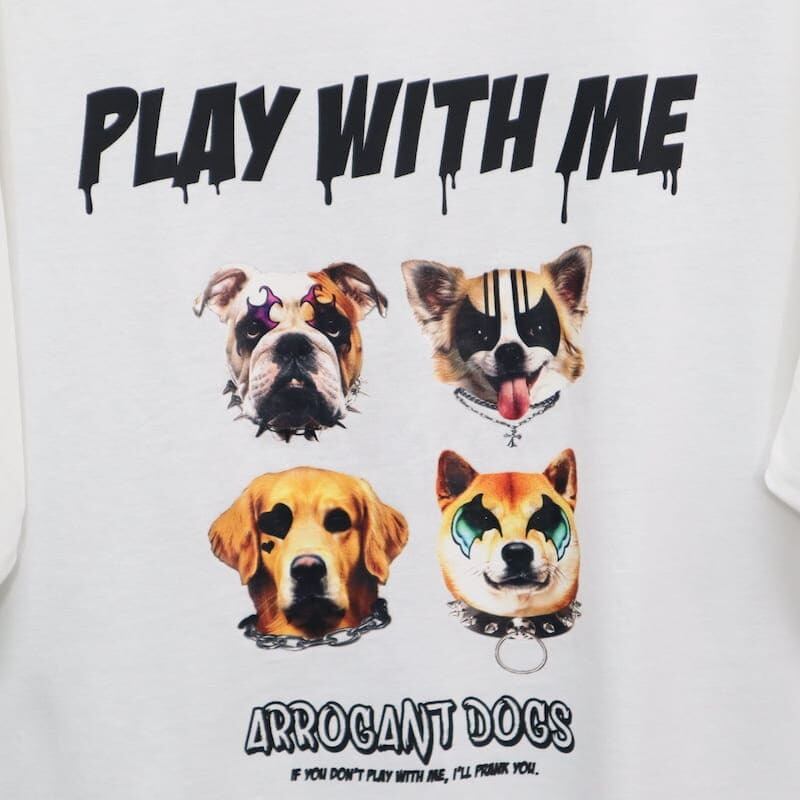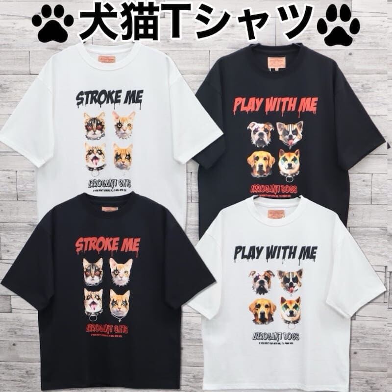 ロックな雰囲気の猫&犬がプリントされた半袖Tシャツ。