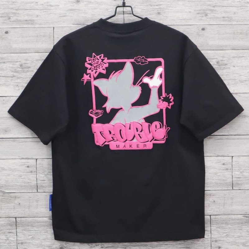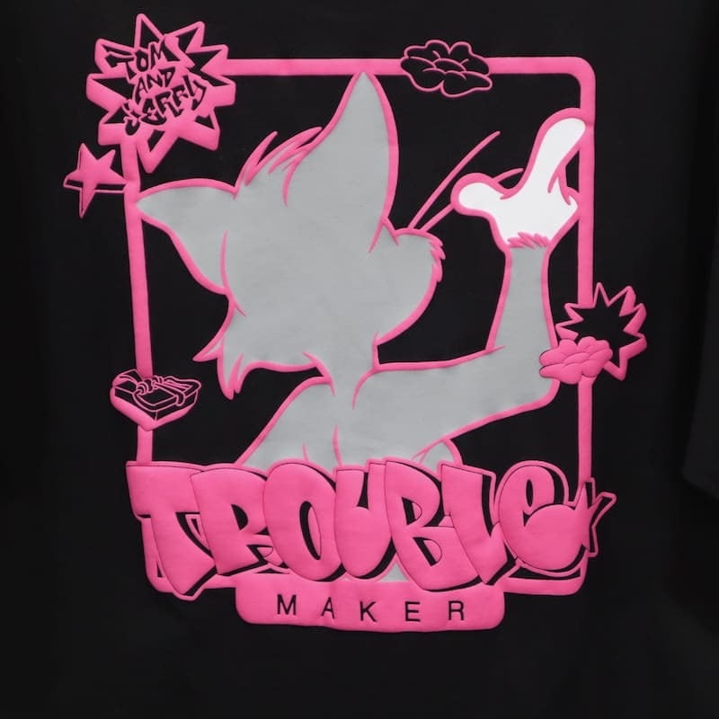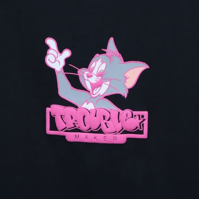 トムジェリのバックスタイルアートを立体感のある発泡プリントでデザインした人気アイテム。