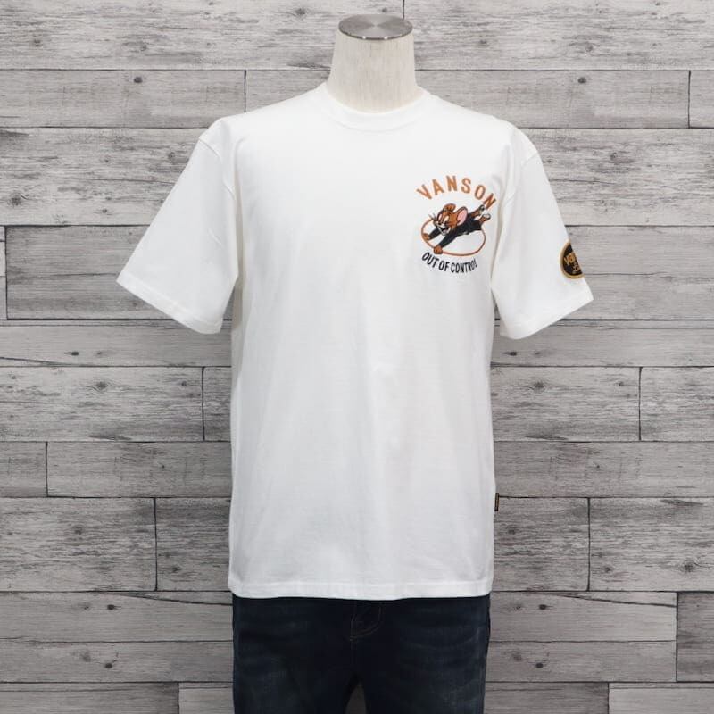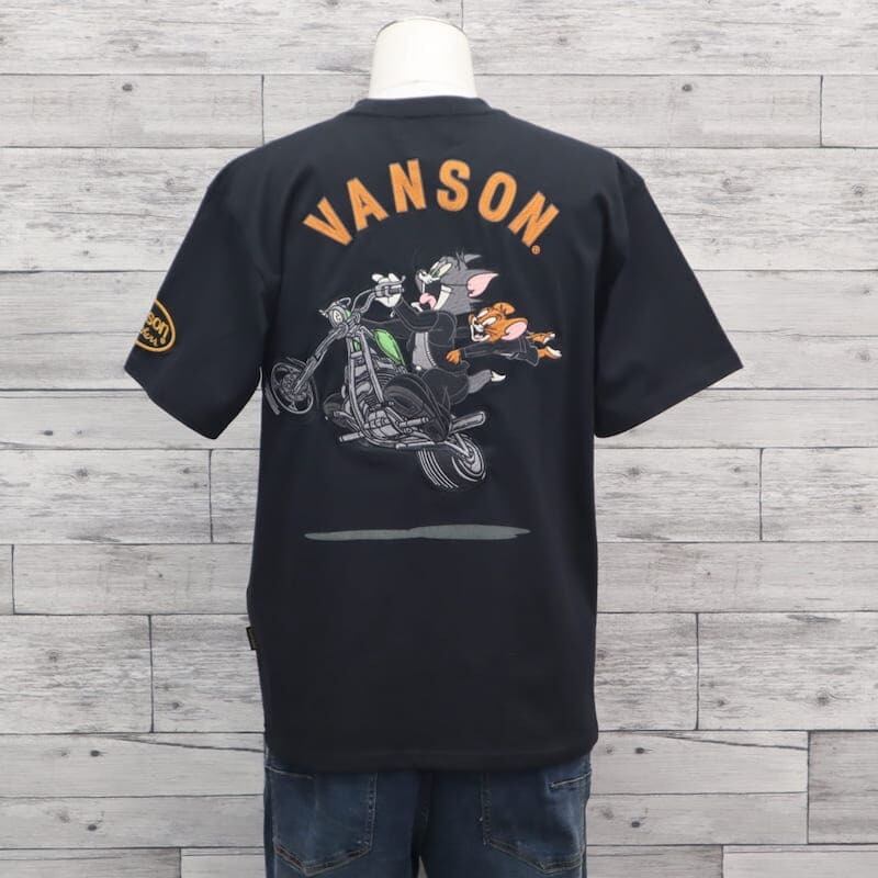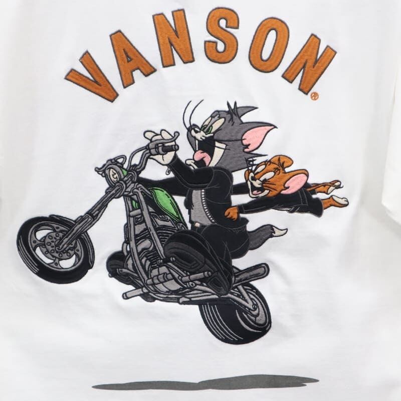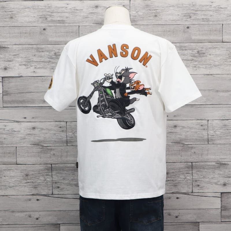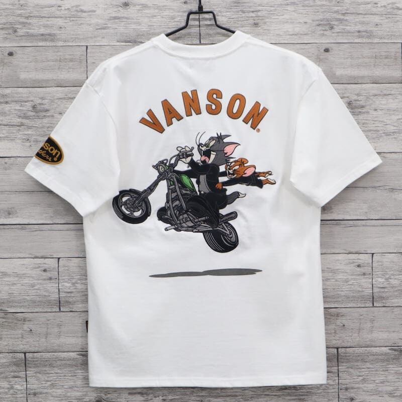 【送料無料】メンズ トムとジェリー VANSON バンソン コラボ 半袖 Tシャツ 半袖Tシャツ ティーシャツ バック 刺繍 胸刺繍 TOM&JERRY トムジェリ バイク レディース ユニセックス 白 ホワイト 黒 ブラック | DEF STORE