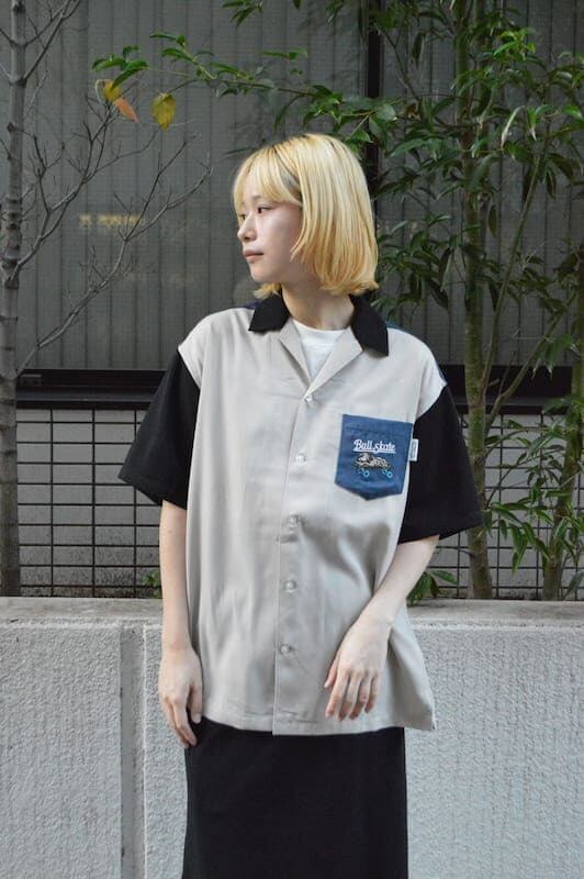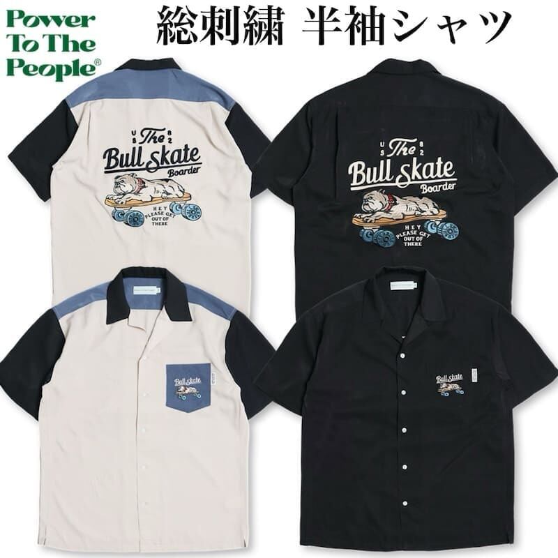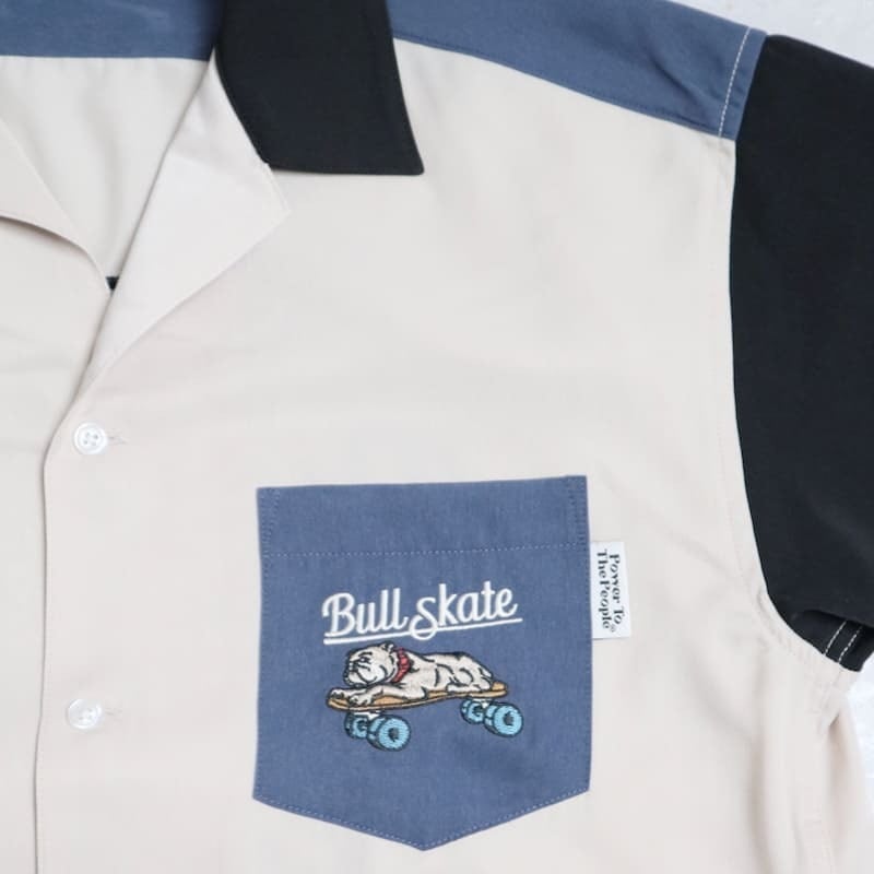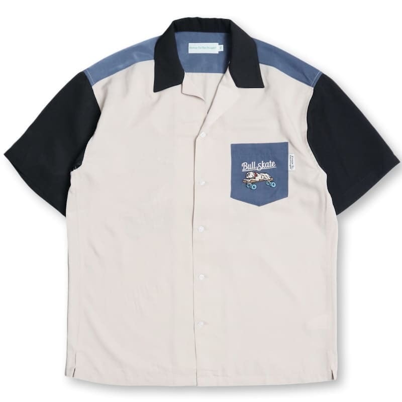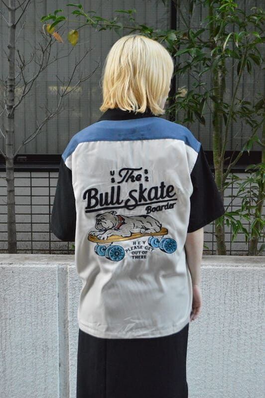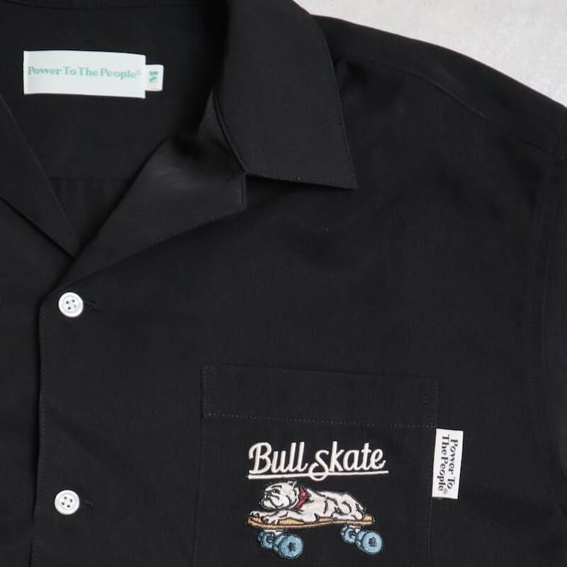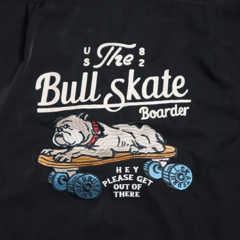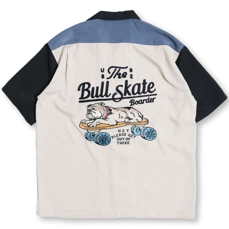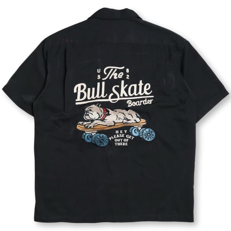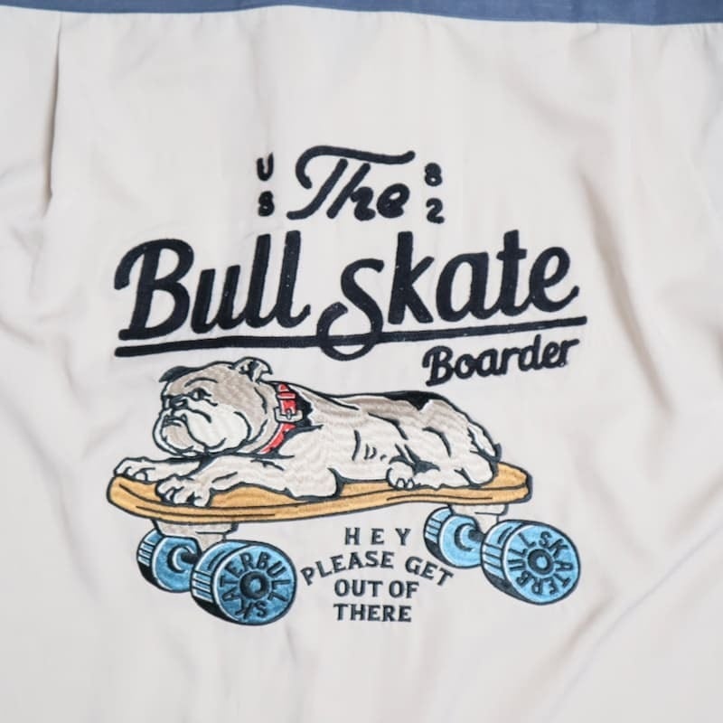 バックとフロントにスケボーに乗ったブルドッグの刺繍を施したオープンカラーシャツ。