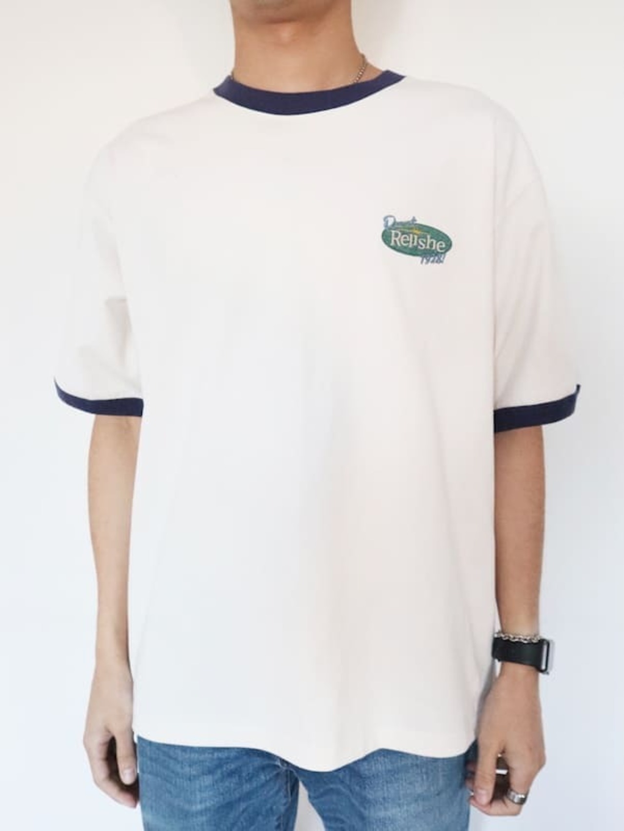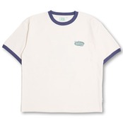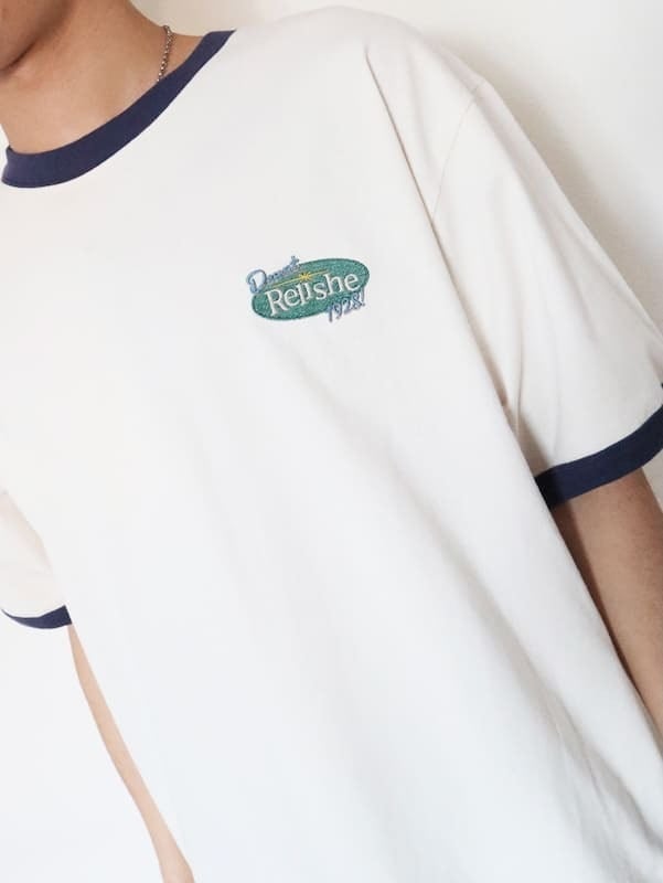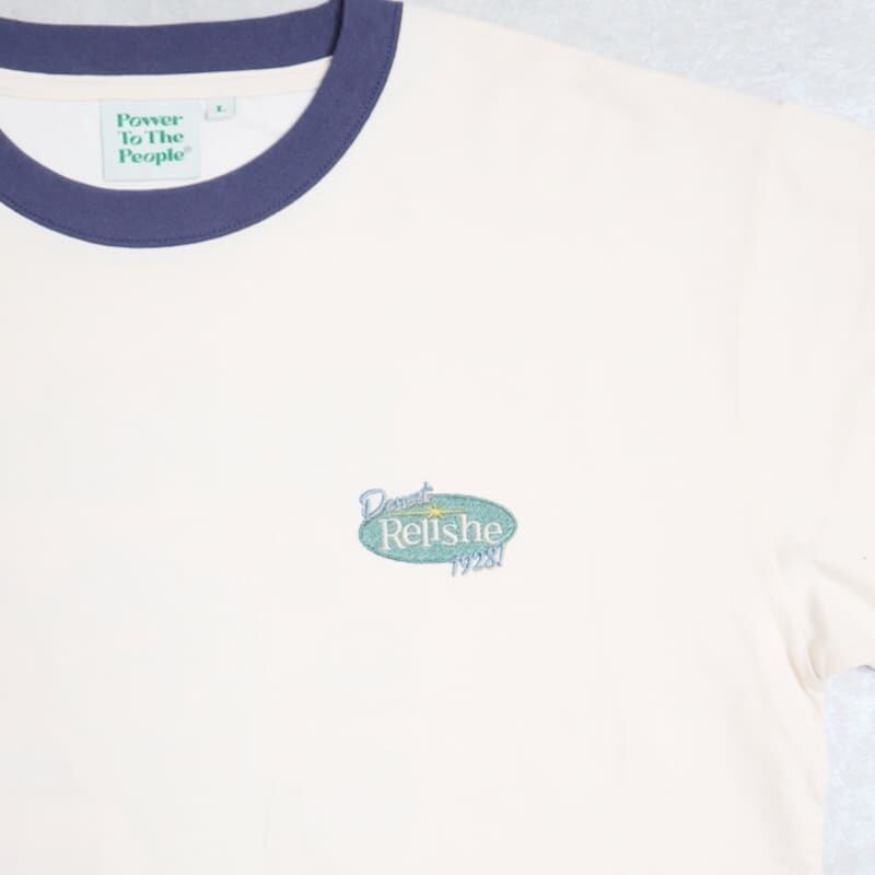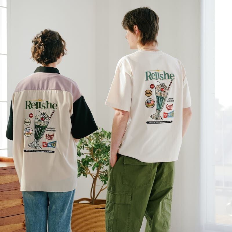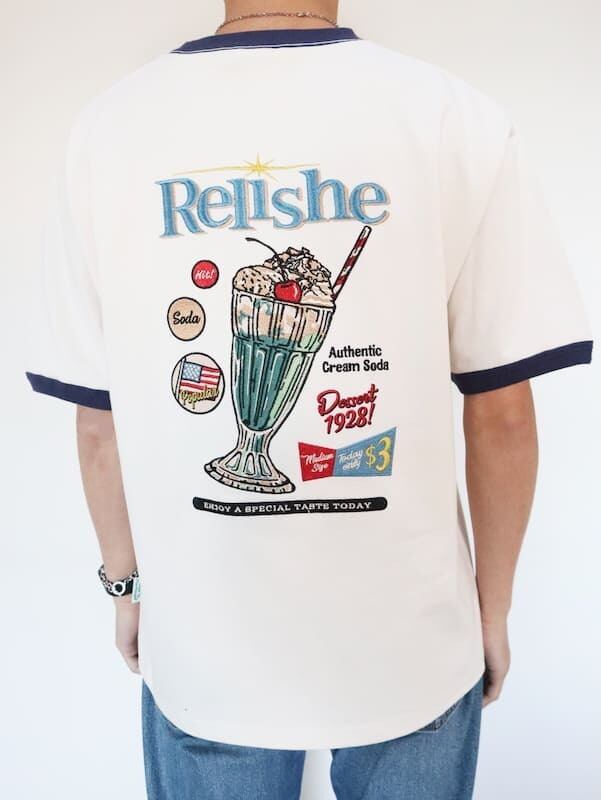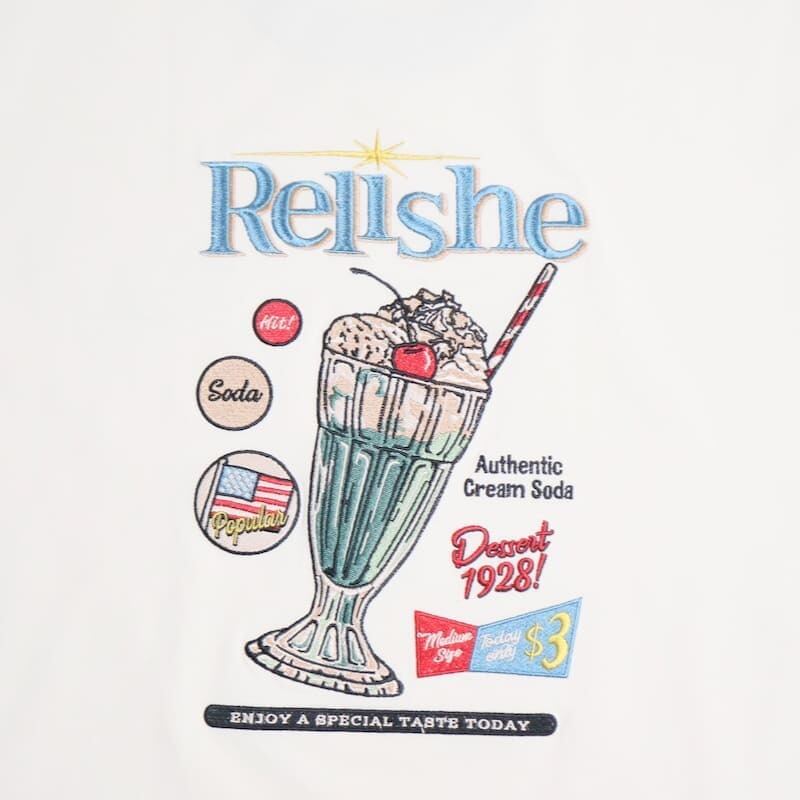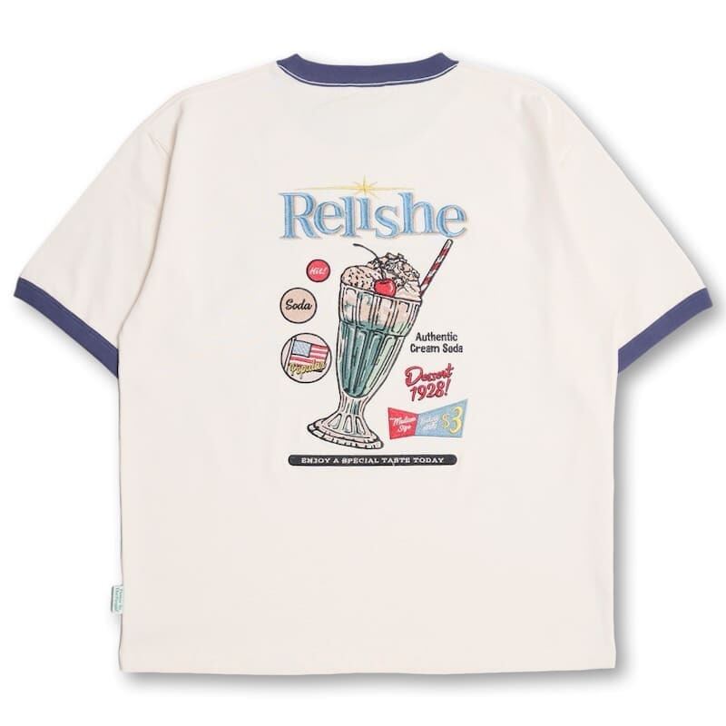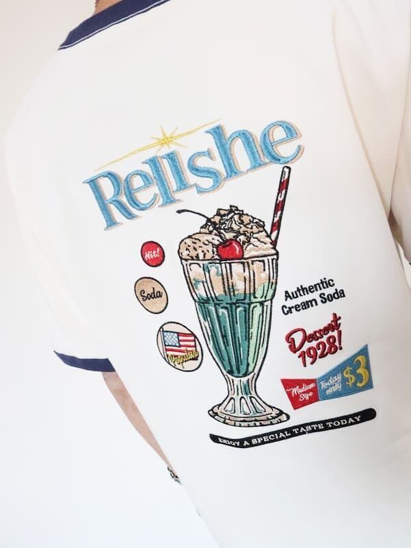 バックにクリームソーダ柄が入ったレトロな雰囲気の刺繍Tシャツ。