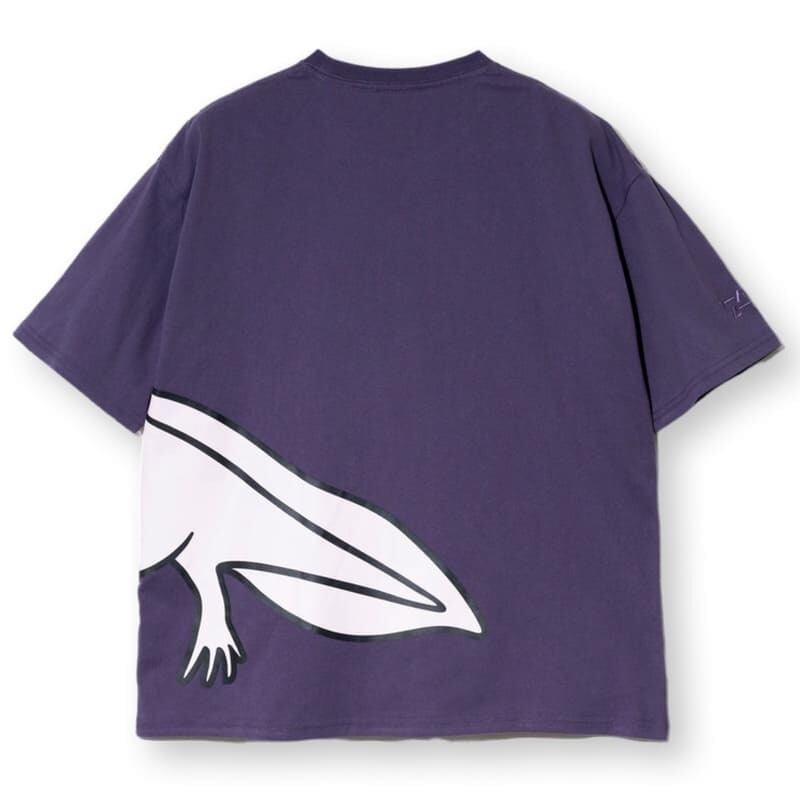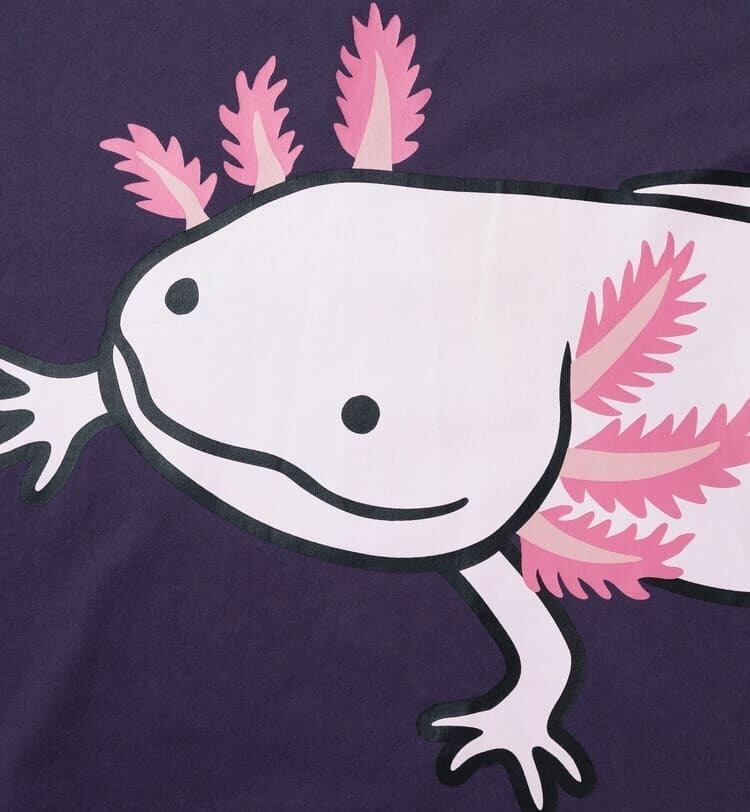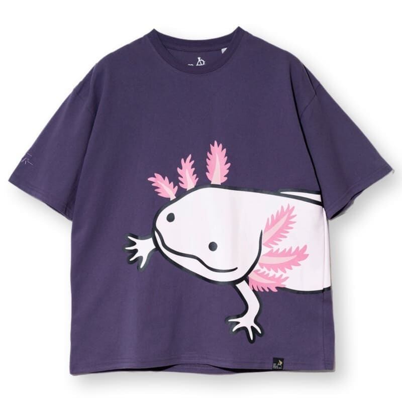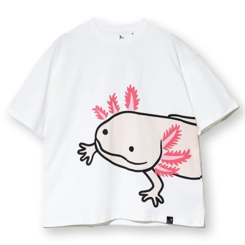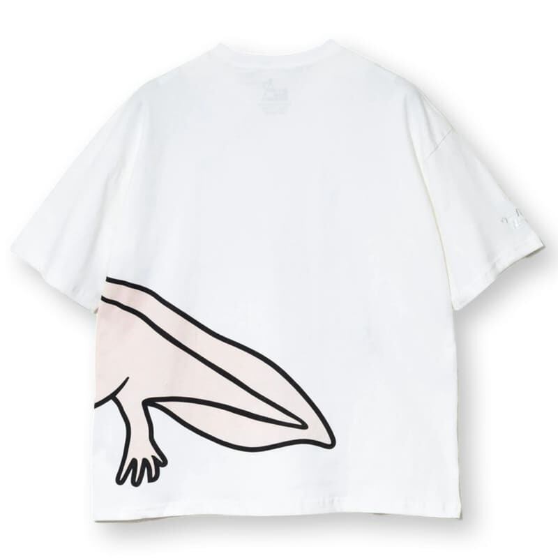 フロントからバックにかけて大きな大きなウーパールーパーがプリントされた半袖Tシャツ。