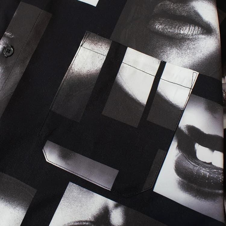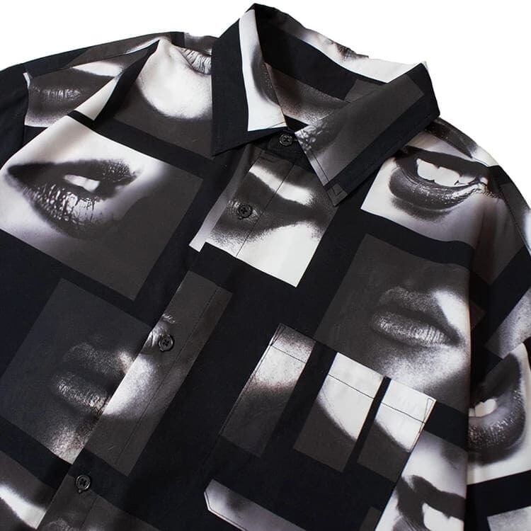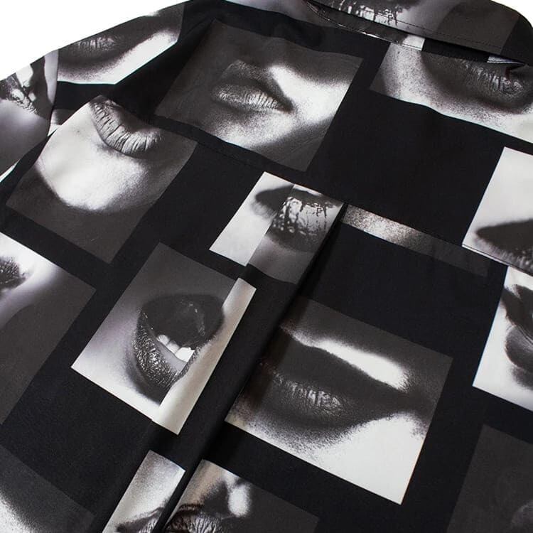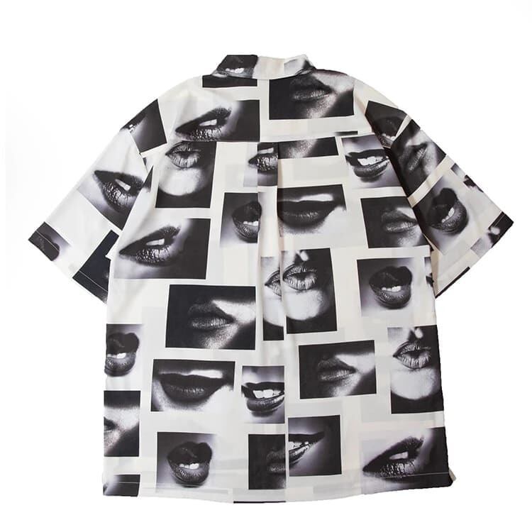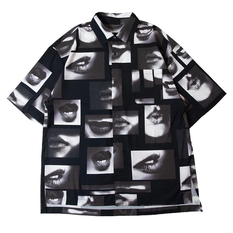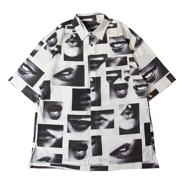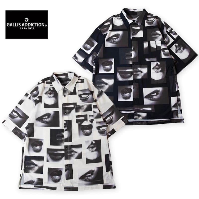 【送料無料】メンズ GALLIS ADDICTION ガリス アディクション 半袖 シャツ 半袖シャツ リップ柄 唇 フォト 総柄 ワイドシルエット ユニセックス レディース モノクロ モノトーン 白 ホワイト 黒 ブラック | DEF STORE