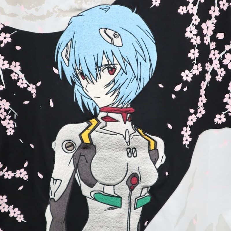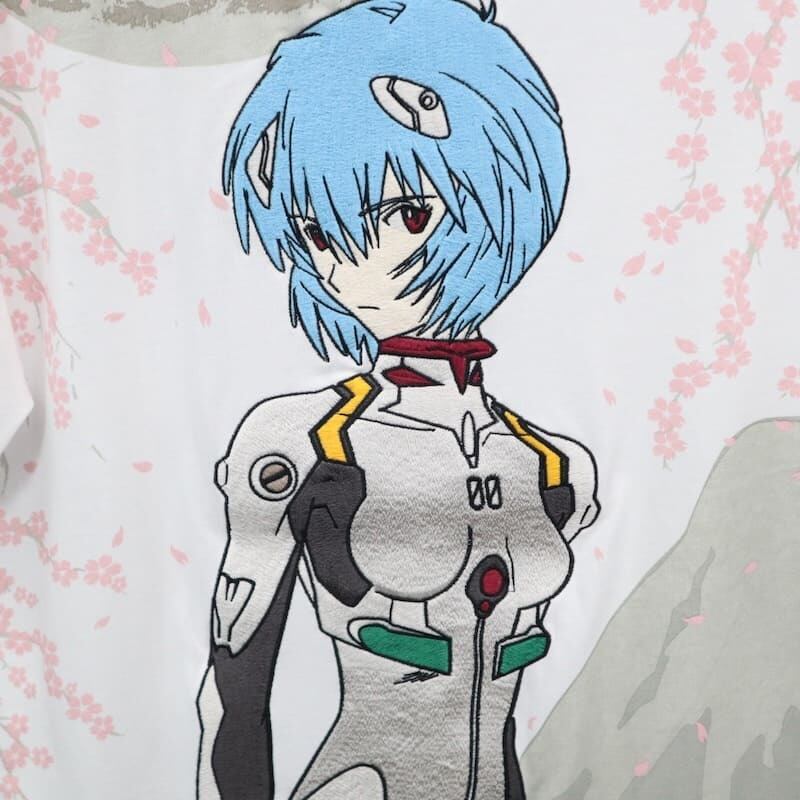 人気キャラクターの1人【綾波レイ】が大きな刺繍で描かれたバックスタイルがポイントの半袖Tシャツ。