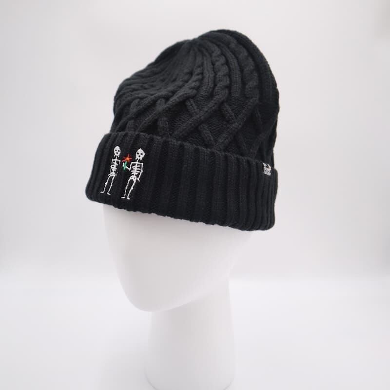ワンポイント刺繍が施されたケーブル編みのニットキャップです。