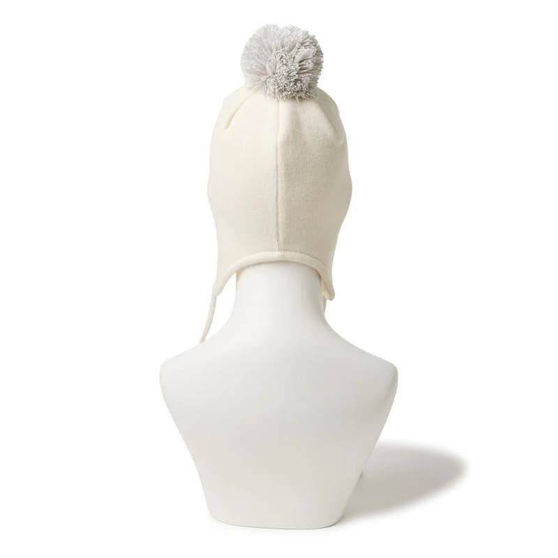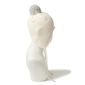 イヤーフラップを配したポンポンニットキャップ。