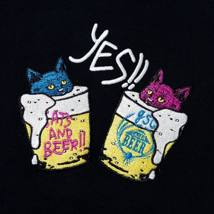前身頃にはボディカラーごとに異なる猫と麦酒の刺繍をオン。