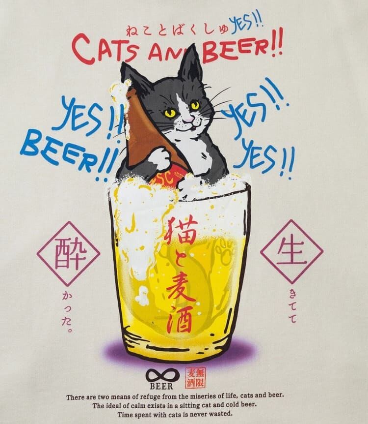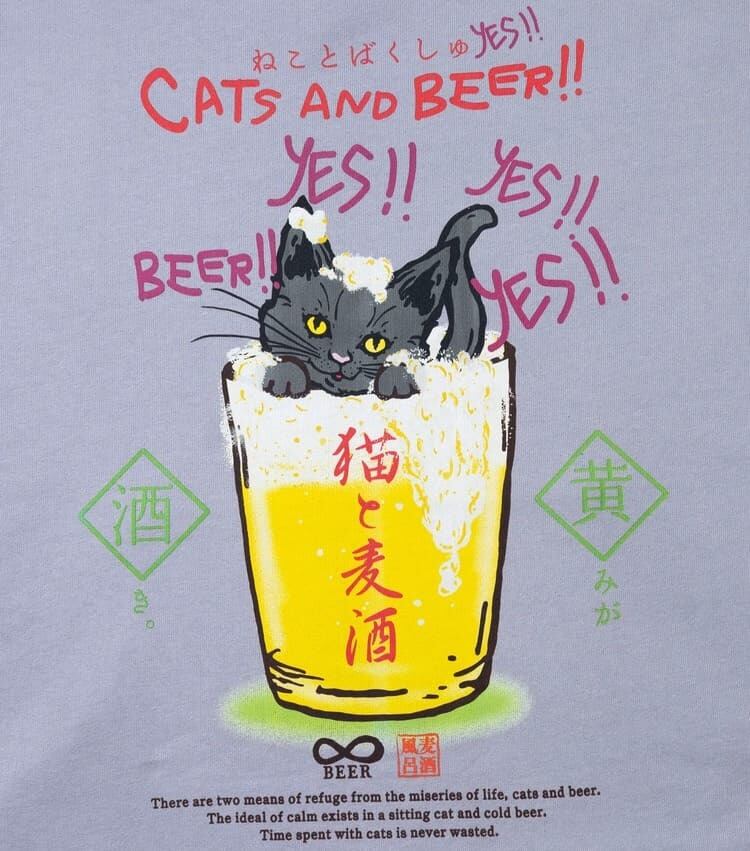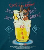 フロントにはさりげないワンポイント、バックには大胆に“猫と麦酒”をプリント。