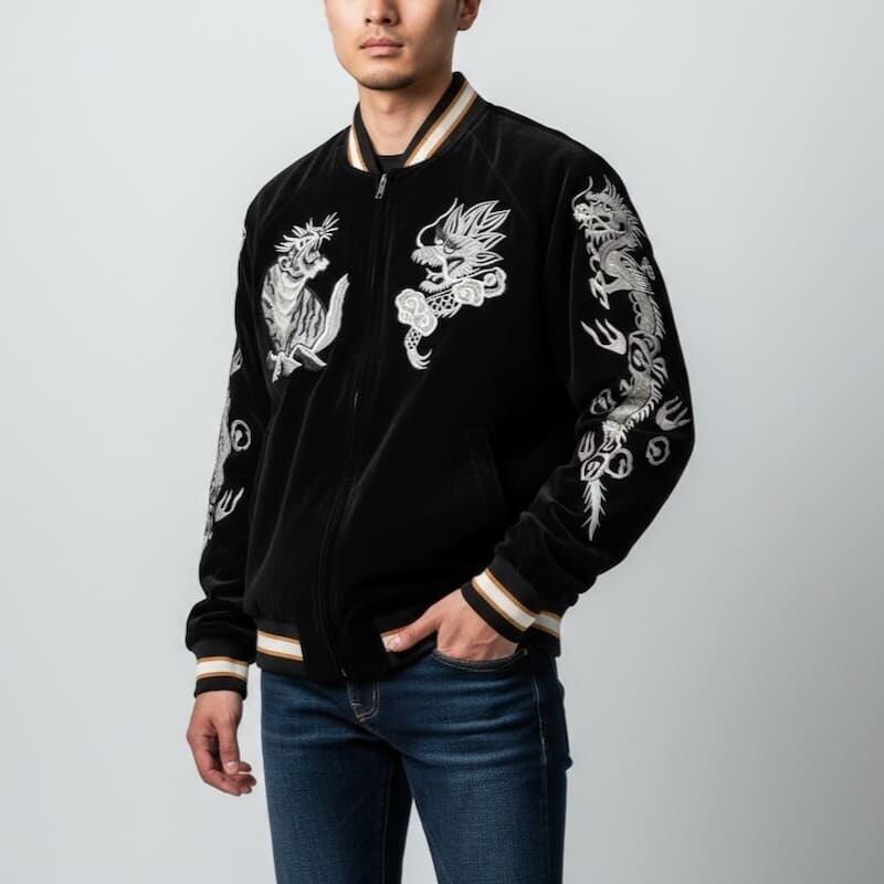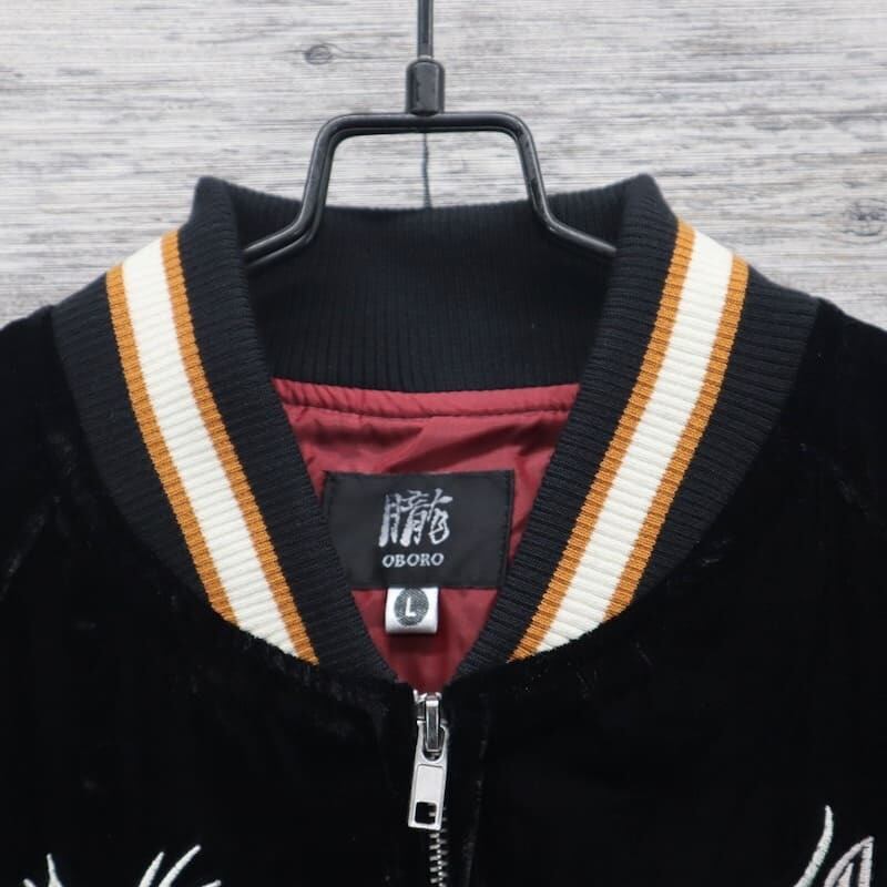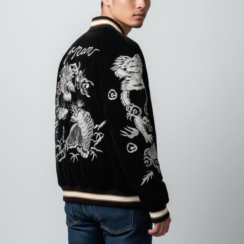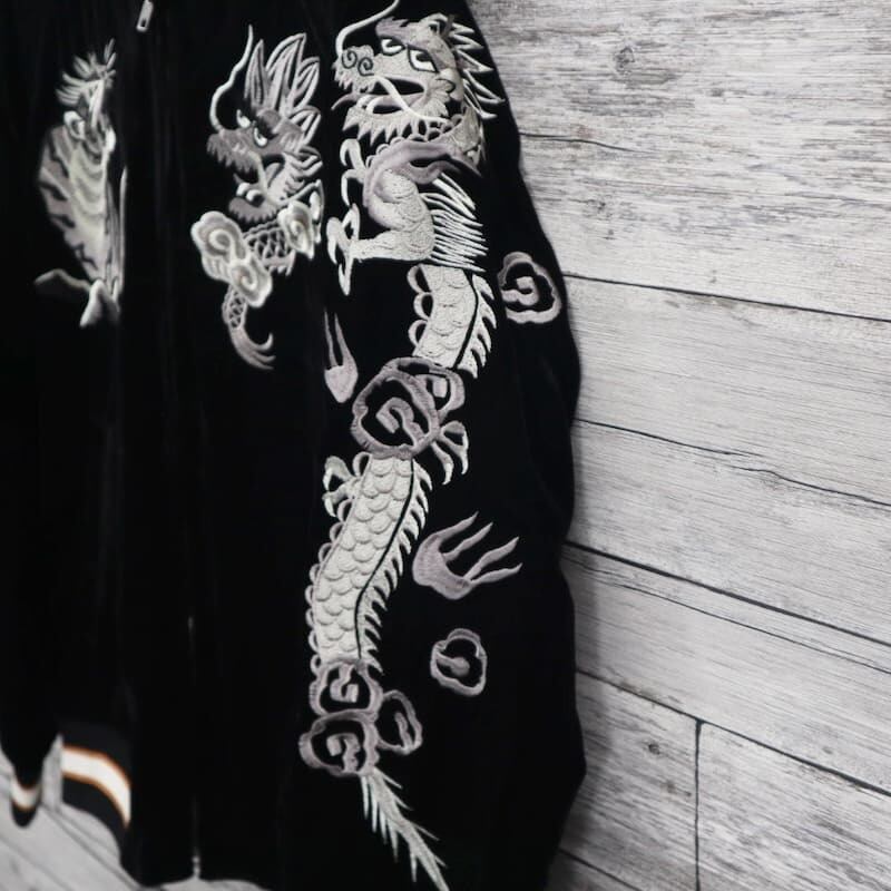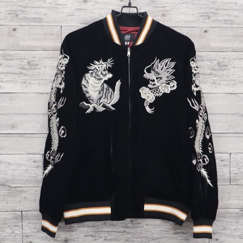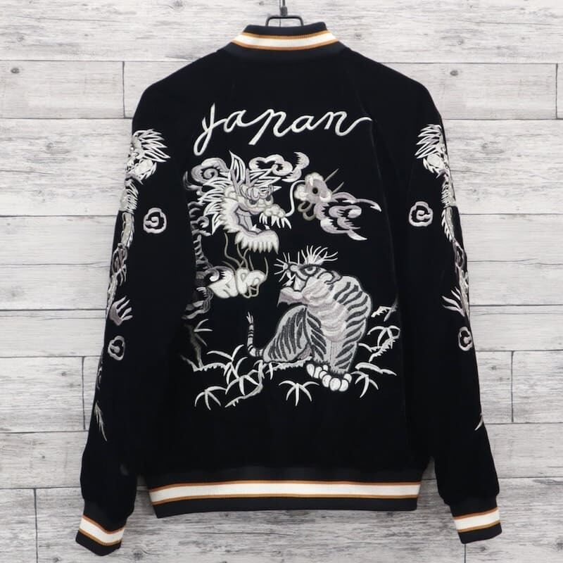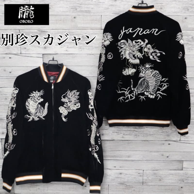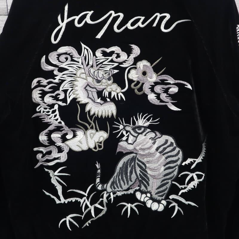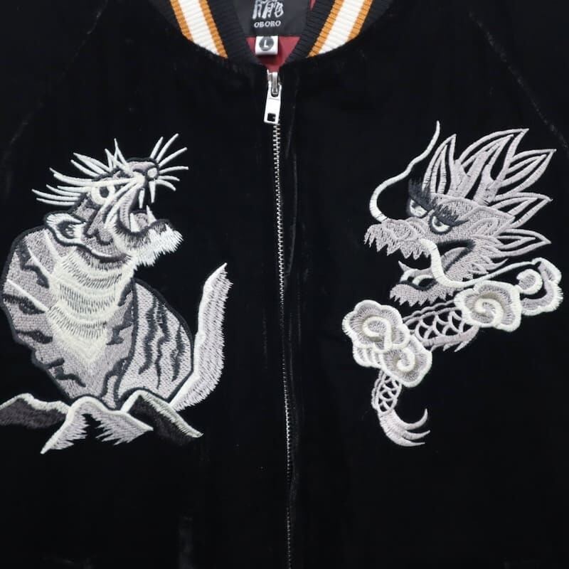こだわりのデザインと豪華な刺繍が人気のブランド、【朧】の龍虎柄の別珍スカジャン。