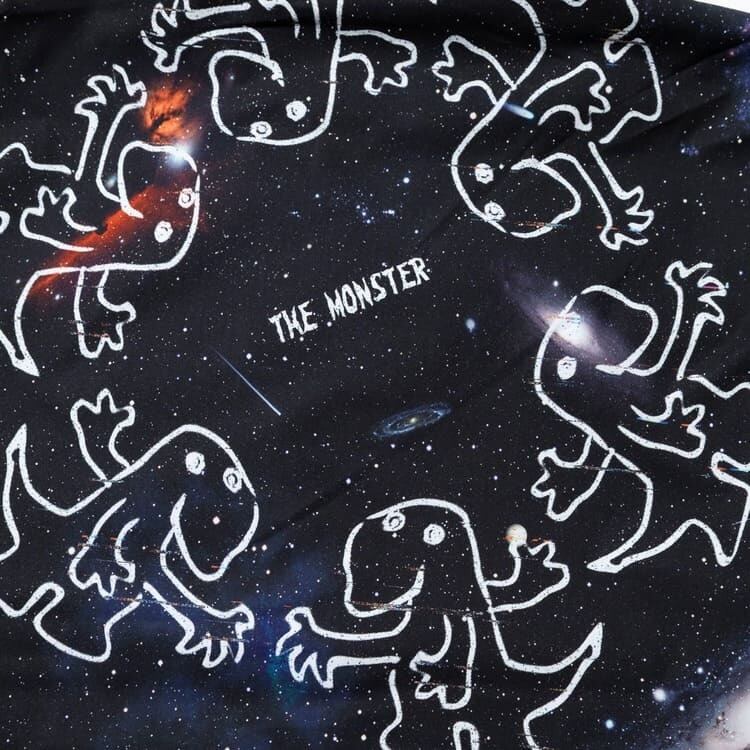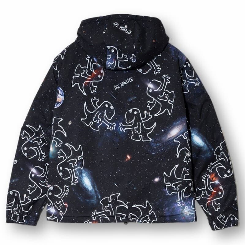 【宇宙】コスモプリントとゆるいテイストのモンスターイラストの組み合わせ。ブラックベースで合わせやすさ◎