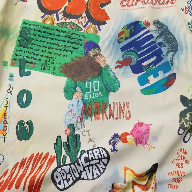 【総柄】go slow caravanおなじみのロゴやグラフィックをプリント。ベースカラーがベージュなのでカジュアルコーデに◎