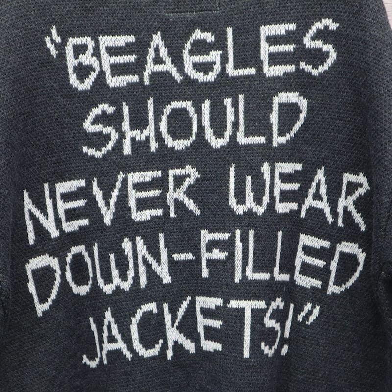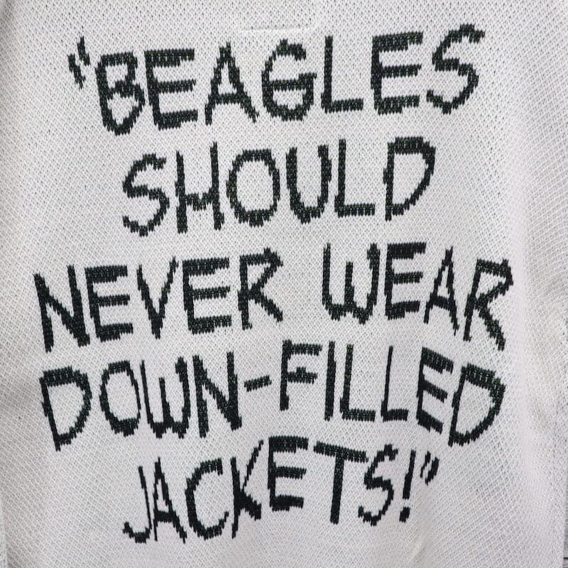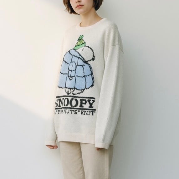 大きなダウンを着てニット帽を被った愛らしいスヌーピーが目を惹く一枚。