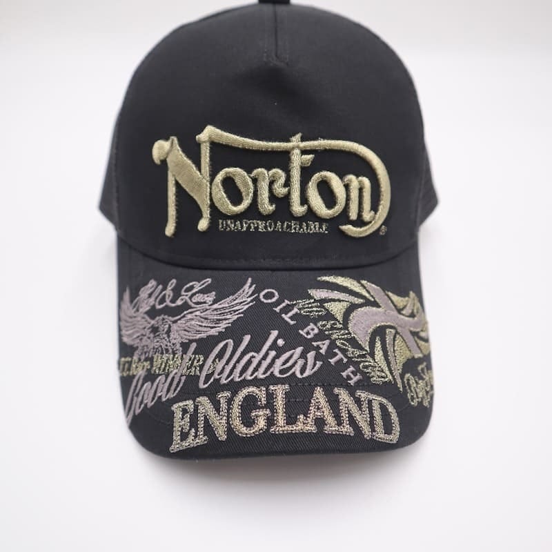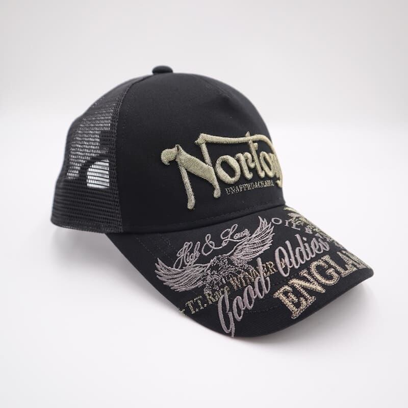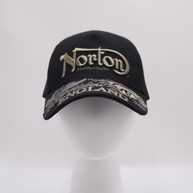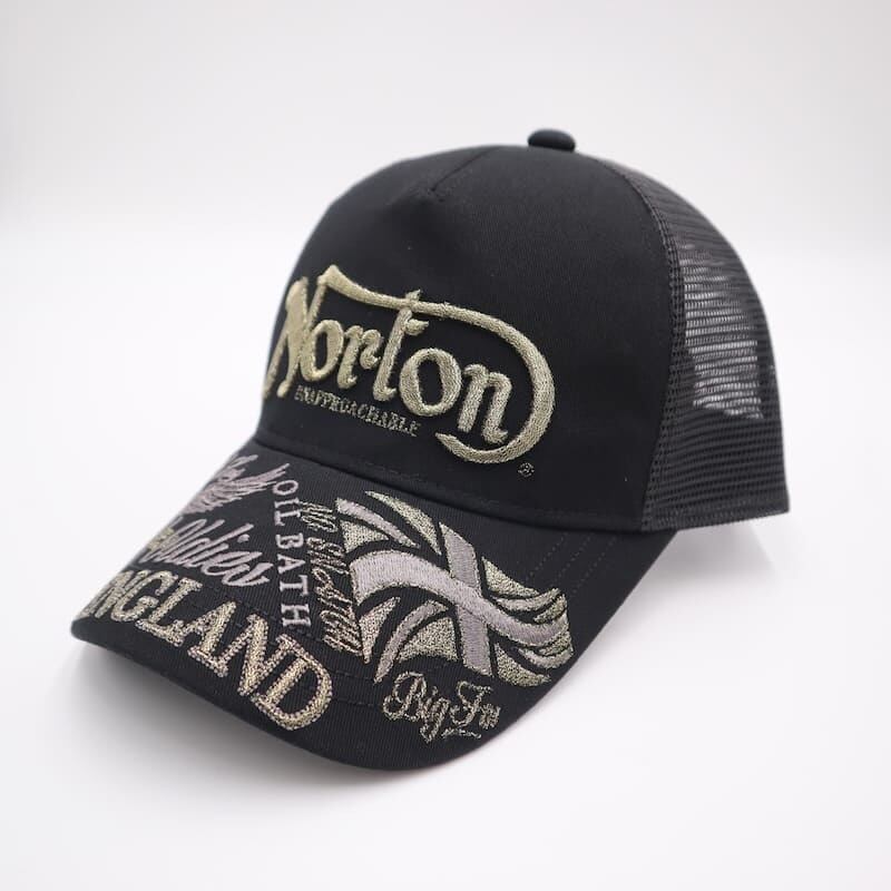 人気のバイカーブランド『ノートン』のラメ刺繍メッシュキャップ。