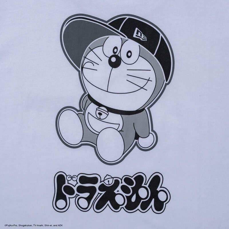 ニューエラのキャップを被ったドラえもんをバックプリントした半袖Tシャツ。
