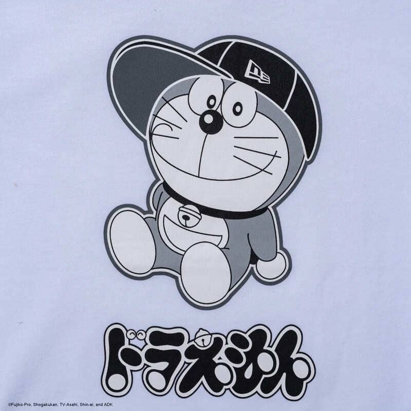 ニューエラのキャップを被ったドラえもんをプリントした半袖Tシャツ。