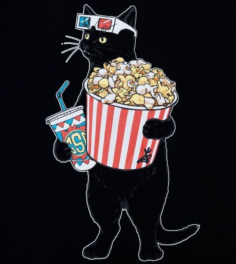 好きな映画に向けて前のめりになる猫の表情やしぐさを、細部まで描き込んだイラストが魅力。